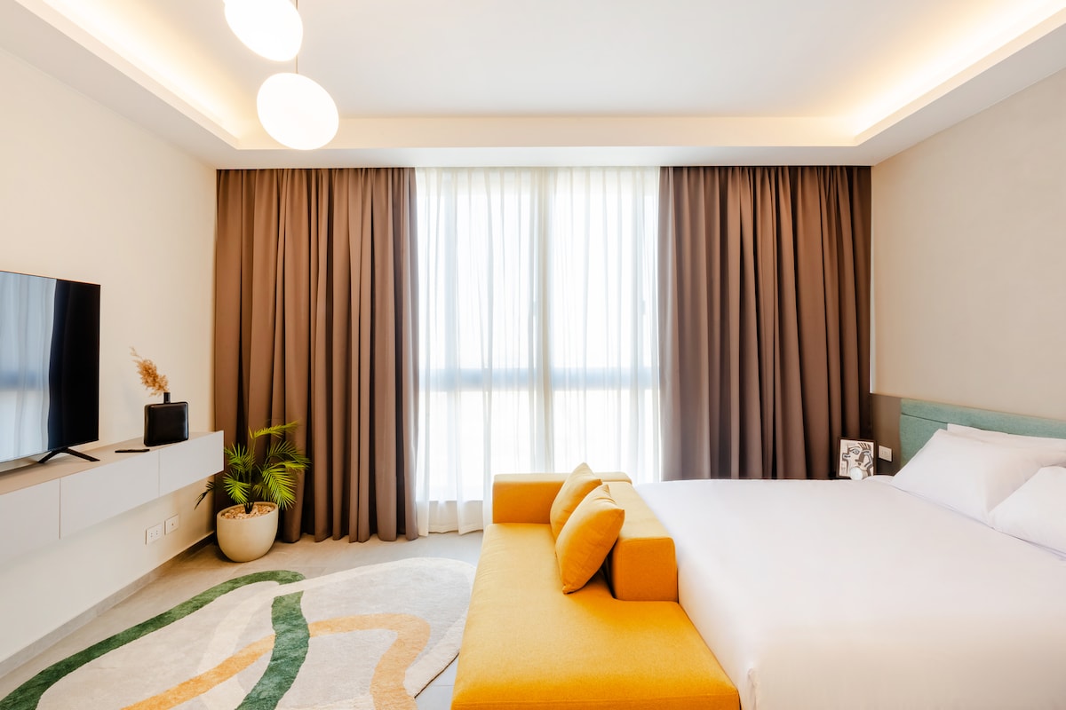 Upplifðu óviðjafnanlegan lúxus í stúdíóíbúðinni okkar í hinum virtu High End Towers. Njóttu stórfenglegs útsýnis yfir borgina í gegnum lofthæðarháa glugga, njóttu sælkeraeldhússins og sökktu þér í mikilfengleg rúmföt til að auka þægindin. Dekraðu við þig í efstu hæð hótelsins. Íburðarmikið athvarf þitt í hjarta borgarinnar bíður upp á óviðjafnanleg þægindi og þægindi.