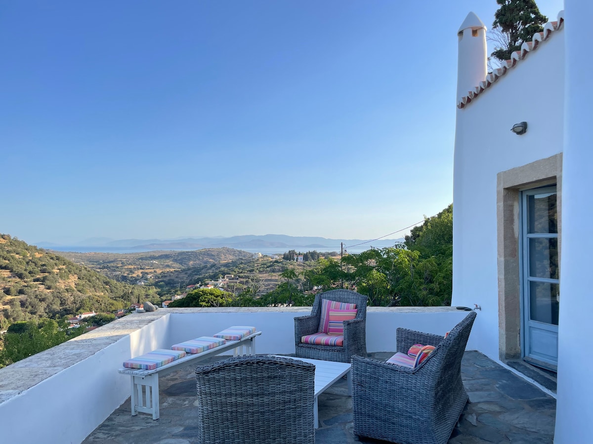 Þetta er gamla heimilið mitt. Húsið er bjart og málað með opnum litum. Reyndi að varðveita gamla karakterinn sinn. Ég geymdi antíkhúsgögn, crockery og meira að segja ljósakrónu fyrir ofan stofuna hjá foreldrum mínum. Það er aftast í garðinum með vínviði og á svölunum að framan er dásamlegt útsýni rétt fyrir ofan sjóinn.