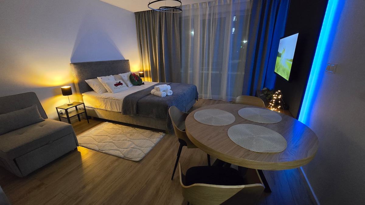 Nútímalegt og notalegt rými fyrir allt að fjóra gesti. Stúdíóið sameinar svefnherbergið, stofuna og eldhúskrókinn með opnu skipulagi. Njóttu þakverandarinnar, líkamsræktarstöðvarinnar, samstarfsrýmisins og leikherbergisins fyrir börn í byggingunni. Göngufæri: Gamli bærinn í 10 mínútur, Museum of the II World War 5 mínútur, St. Mary's Church, Amber Sky Ferris Wheel, Gdanski Shipyard í göngufæri! Veldu rétta gististaðinn í Gdansk!