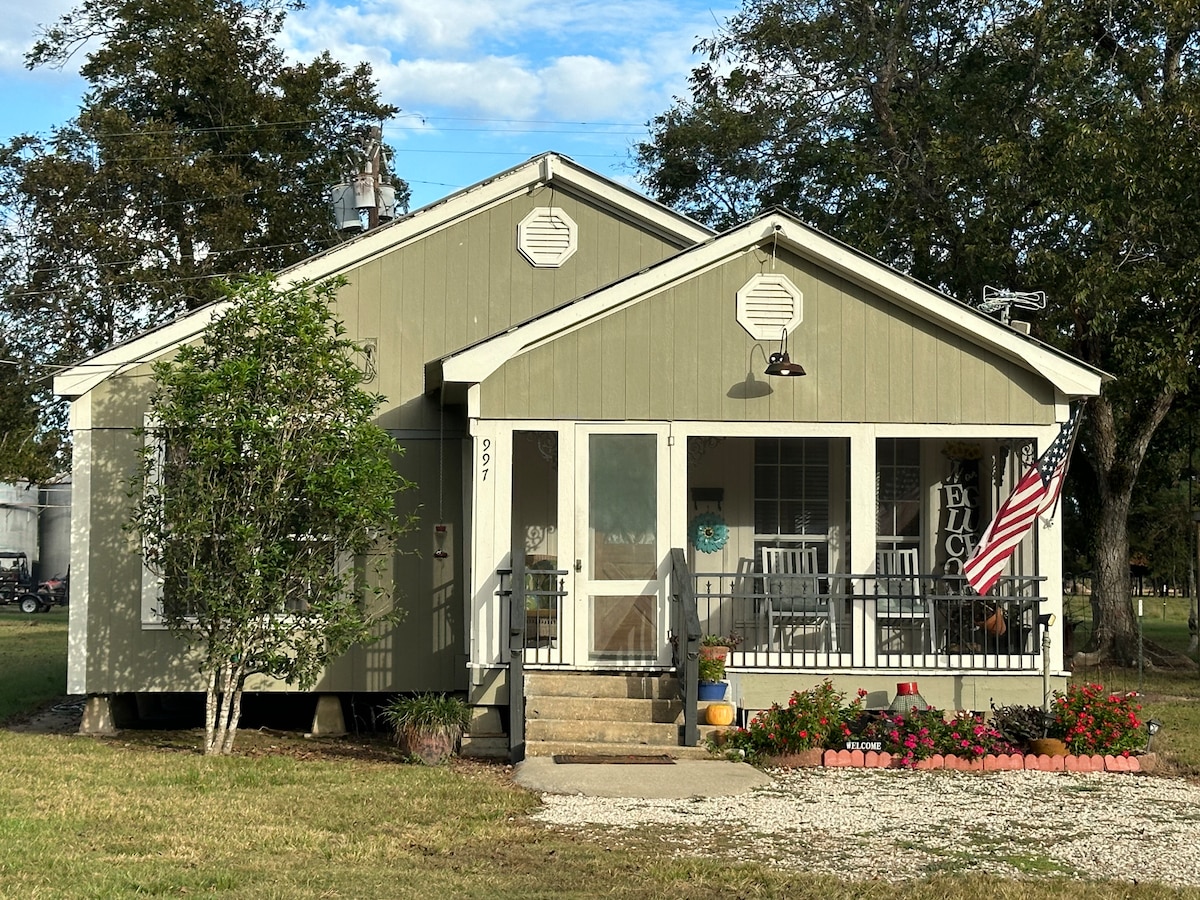 Kyrrlátt sveitasetur á 20 hektara býli. Staðsett við fallega Louisiana Bayou des Glaises. Hverfi sem stuðlar að skokki, göngu og reiðhjóli á mílum af skuggalegum blacktop vegi sem er hliðstæður flóanum. Spring Bayou WMA er staðsett í aðeins 8,5 km fjarlægð - með bátahöfn, fjórhjólaslóðum, veiðum, fiskveiðum, gönguferðum o.s.frv. Áreiðanlegt þráðlaust net (þar sem margar vinsælar streymisþjónustur eru innifaldar eða nota sitt eigið) og vel útbúið eldhús gerir tímann sem er varið innandyra ánægjulegur.