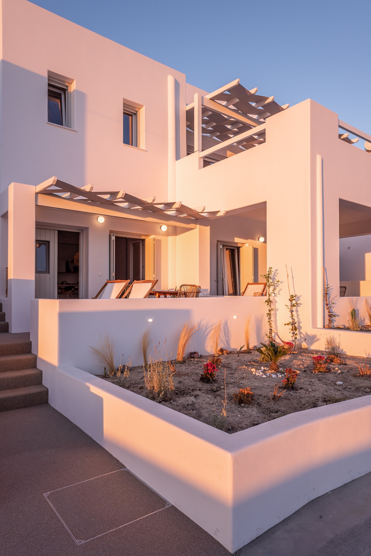 Slakaðu á í Echoes Exclusive-svítunni á Echoes Milos sem er fullkomin fyrir tvo gesti sem sækjast eftir þægindum og ró. Hreiðraðu þér í king-size-rúminu, njóttu kaffis úr Nespresso-vélinni þinni og gæddu þér á hrífandi sjávarútsýninu. Svítan er með minibar, fullbúnu eldhúskrók utandyra og sturtum bæði inni og úti, sem tryggir notalega og afskekta dvöl með öllum nútímalegum þægindum.
