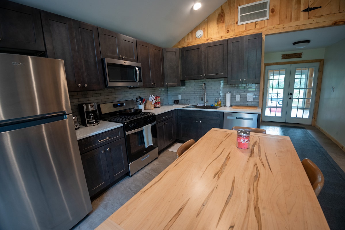 Verið velkomin í felukofann þar sem þú getur slappað af í faðmi náttúrunnar. Hér getur þú sötrað uppáhaldið þitt á grillinu, sest niður í Adirondack-stólunum á svölunum eða einfaldlega slakað á innandyra. Komdu að kvöldi til, komdu saman við eldstæðið á veröndinni til að fylgjast með eldflugunum dansa eða slakaðu á í heita pottinum á bakveröndinni. Þetta er tilvalin blanda af náttúrulegri kyrrð og heimilislegum þægindum. Á veturna er notalegt að vera við skógareldinn í stofunni og fylgjast með uppáhalds sjónvarpsþáttunum þínum.