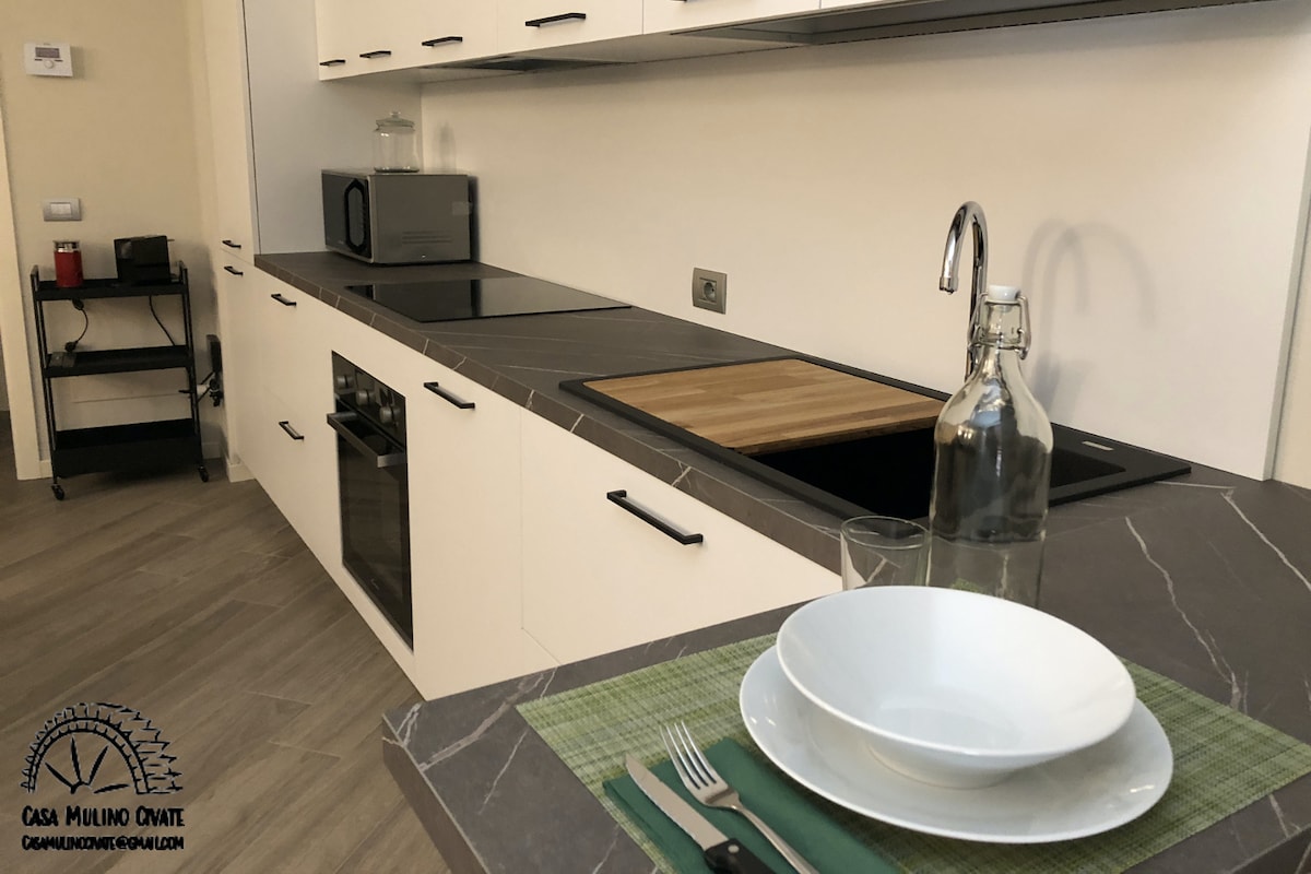 Ný ellefu herbergja íbúð er staðsett í Onno, skammt frá bænum Oliveto Lario, á vesturströnd Lecco-greinarinnar, við rætur hins fræga Lariano-þríhyrnings með náttúrulegum görðum og jarðfræði- og grasafræðilegum undrum, með útsýni yfir hina dásamlegu strönd, í 10 mínútna akstursfjarlægð frá Bellagio og Lecco. Staðsetningin er glæsileg og afslappandi, tilvalið að eyða ógleymanlegum stundum á Como-vatni. Húsgögnin eru nútímaleg, grátt og hvítt er ráðandi.
