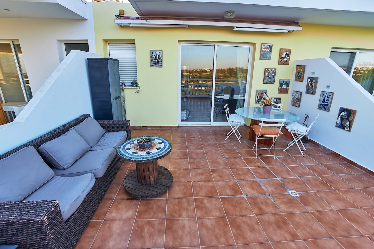 Nútímalega, endurnýjaða tveggja svefnherbergja lúxusíbúðin okkar er staðsett á fyrstu hæð í lítilli tveggja hæða byggingu meðfram Poseidonos-breiðstrætinu. Almenningsströndin er hinum megin við götuna, aðeins í 150 metra fjarlægð. Strætisvagnastöð(til/frá flugvellinum) er í 50 metra fjarlægð. Íbúðin er umkringd mismunandi verslunum, krám og börum, allt í göngufæri. Gestir geta notið skoðunarferða, vatnaíþrótta og annarrar afþreyingar á svæðinu. Ókeypis þráðlaust net og örugg bílastæði í boði. Velkominn pakki og handbók fylgir.