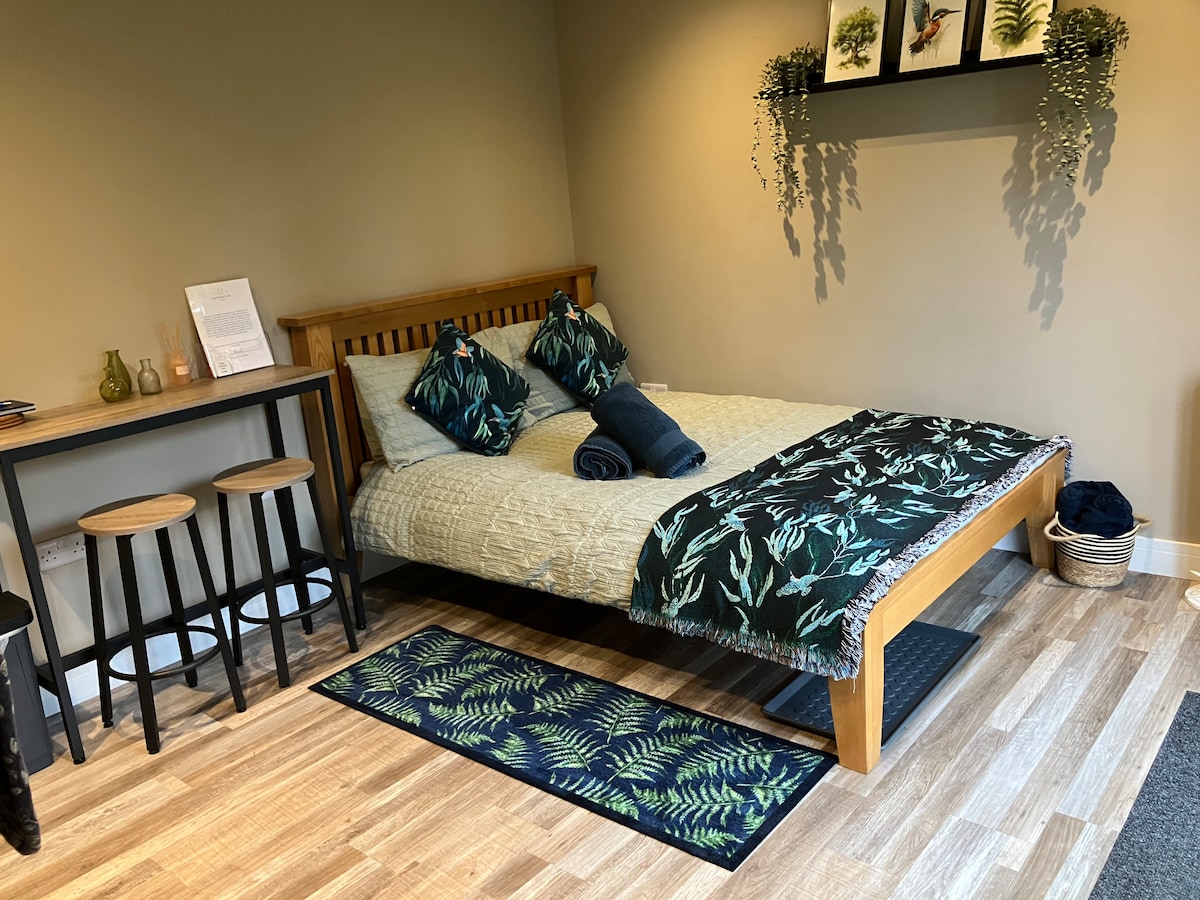 Bluebell Pod is our couples pod, with a double bed and pull out sofa, dining table, living space and a romantic outdoor bathtub with fantastic lake views and views of the farm. Our self catering pods have a kitchenette with induction hobs and a microwave. We also have outdoor seating and a private BBQ for an al-fresco dining experience. Each pod has luxurious décor selected with extra comfort in mind. Near Thornbury, Bristol where you will find lots shops and restaurants.