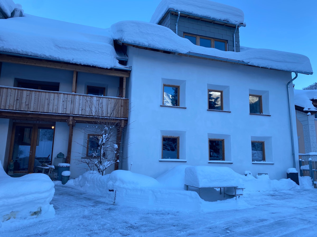 Das ökologisch renovierte Bauernhaus befindet sich im Künstlerviertel von Susch am Ende einer Sackgasse angrenzend an die wilde Natur des Engadins.