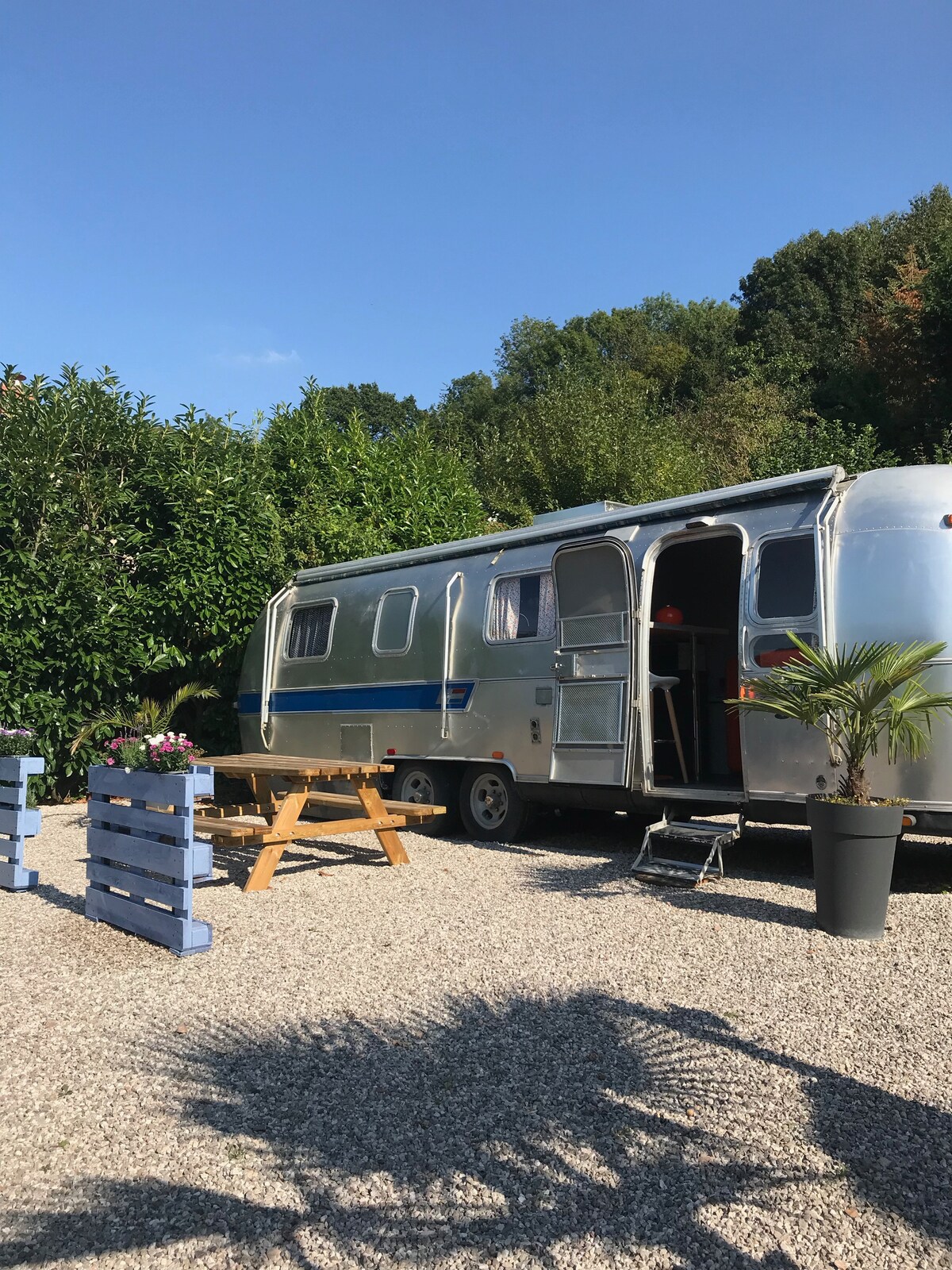 En pleine campagne, au cœur du village de Fléchinelle, vous serez hébergés dans une véritable caravane Airstream Vintage en aluminium des années 1970. Celle ci a été entièrement rénovée pour vous offrir le confort nécessaire : cuisine aménagée avec plaque électrique, micro-ondes, réfrigérateur, vaisselle, accessoires de cuisine, salle de bain avec douche, lavabo, toilettes, chauffage, climatisation. Le linge vous est fourni (draps, serviettes de toilette). Petit déjeuner possible en supplément.