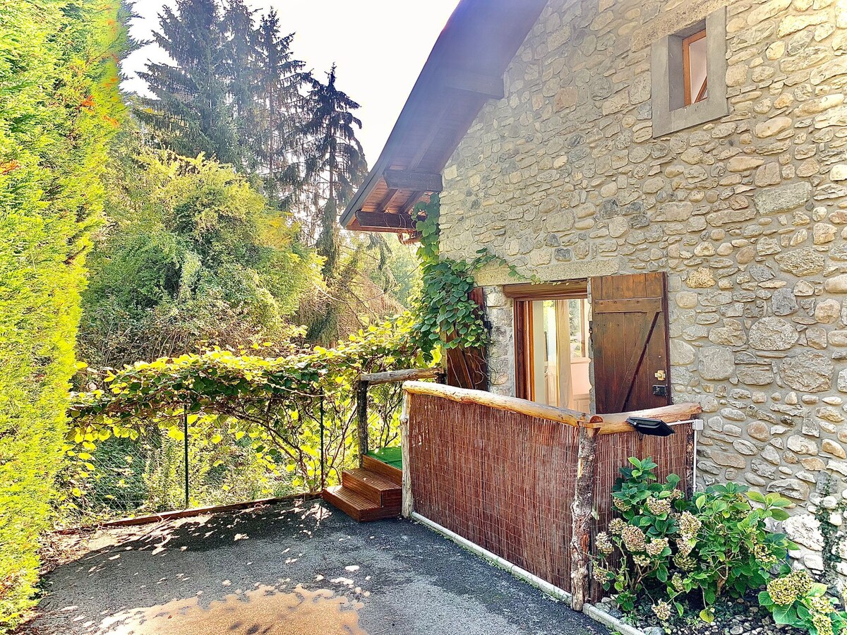 Cocon idéal pour une échappée en amoureux à 10 mn du lac d’Annecy. Au RDC d’une maison de caractère, mignon T2 de 30m² avec terrasse, jardinet et salon de jardin, parasol. Entièrement rénové avec balnéo et cheminée électrique, télévision, wifi, salle de bain, toilette, cuisine (micro-onde, plaque de cuisson, four, frigo, cafetière nespresso, appareil à raclette...) Draps, serviettes de bain et peignoirs sont fournis. Entrée indépendante. Parking privé Environnement paisible Discrétion assurée