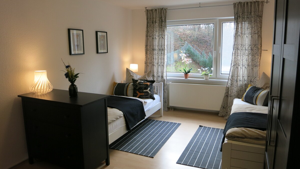 Mjög lítið en gott! Njóttu friðar og afslöppunar í notalegu gestaíbúðinni okkar í Erfurt-hverfinu í Hochheim. Við bjóðum upp á allt sem þarf fyrir afslappaða dvöl, þar á meðal frábært útsýni yfir Erfurt Steigerwald. Frá miðborginni, 15 mínútur með rútu eða jafn löng ferð á hjóli, falleg leið meðfram Gera og í gegnum Luisenpark.