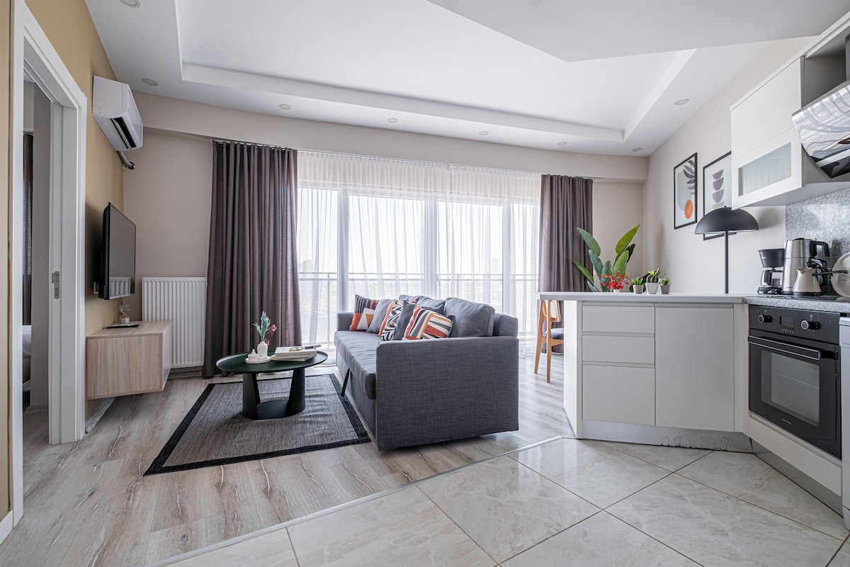Athugaðu: Þessi íbúð hentar aðeins fyrir langvarandi dvöl í mánuð. 35% afsláttur af mánaðarlöngum gistingu og 40% afsláttur af gistingu sem varir í tvo mánuði eða lengur. Þú getur skemmt þér með fjölskyldu þinni og vinum í þessari íbúð sem er hönnuð af mikilli nákvæmni. Þetta er íburðarmikill og miðlægur staður á E-5. Það er 5 mínútna göngufjarlægð frá þekktum verslunarmiðstöðvum og Metrobus, stærsta almenningssamgönguneti Istanbúl. Það er veitingastaður, Starbucks og Migros á staðnum