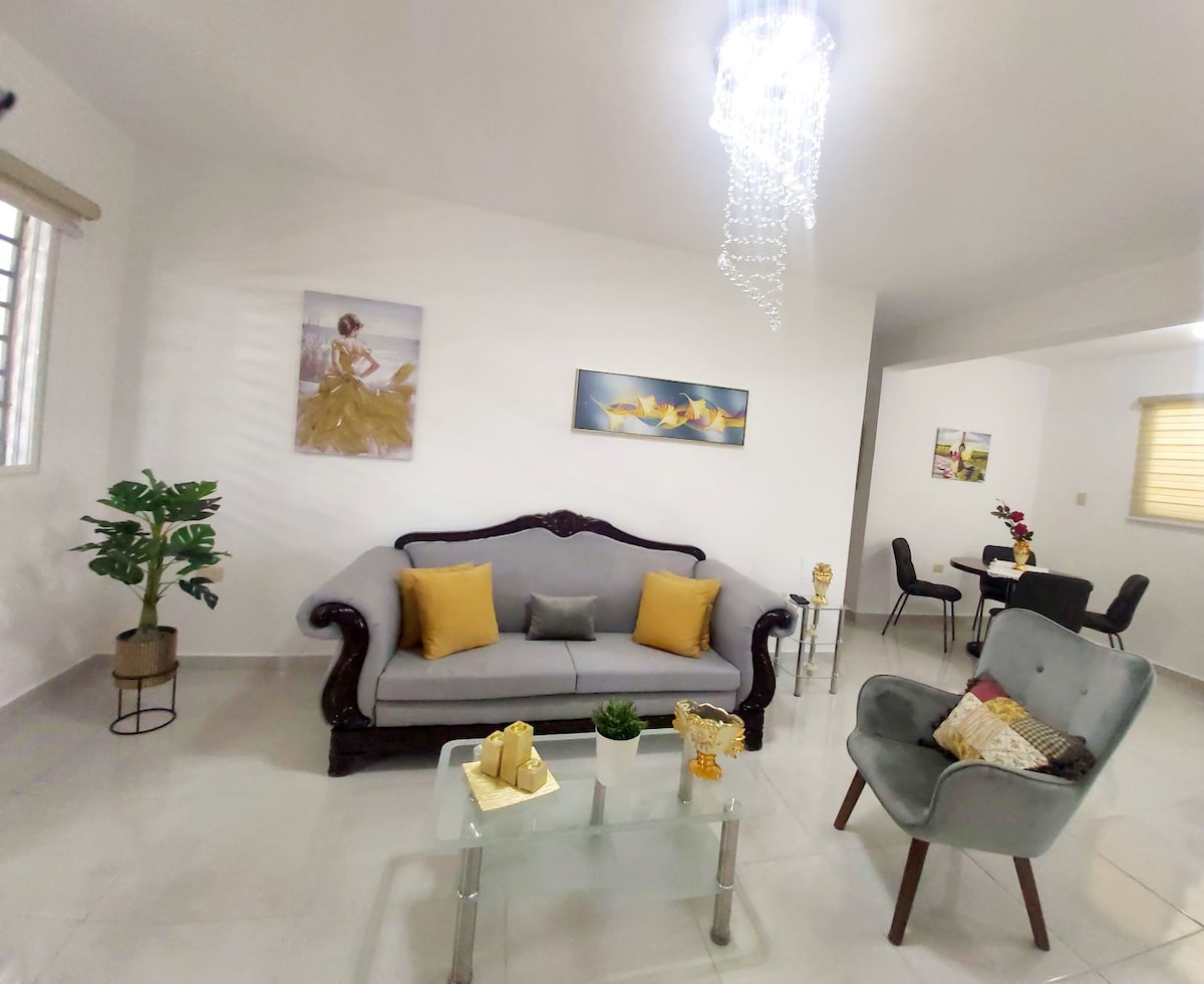 Verið velkomin á heimili þitt í Salcedo! Í þessari heillandi íbúð á 4. hæð eru þrjú rúmgóð herbergi sem henta vel fyrir fjölskyldur eða hópa. Njóttu tveggja nútímalegra baðherbergja og útbúins eldhúss. Slakaðu á á svölunum með útsýni. Stofan og borðstofan eru þægileg rými til að deila. Við bjóðum upp á háhraðanet, heitt vatn og spennubreyti. Í þvottahúsinu er þvottavél og þurrkari. Þú hefur einnig aðgang að leikvelli og körfuboltavelli. Þessi íbúð er tilvalin fyrir eftirminnilegt frí.