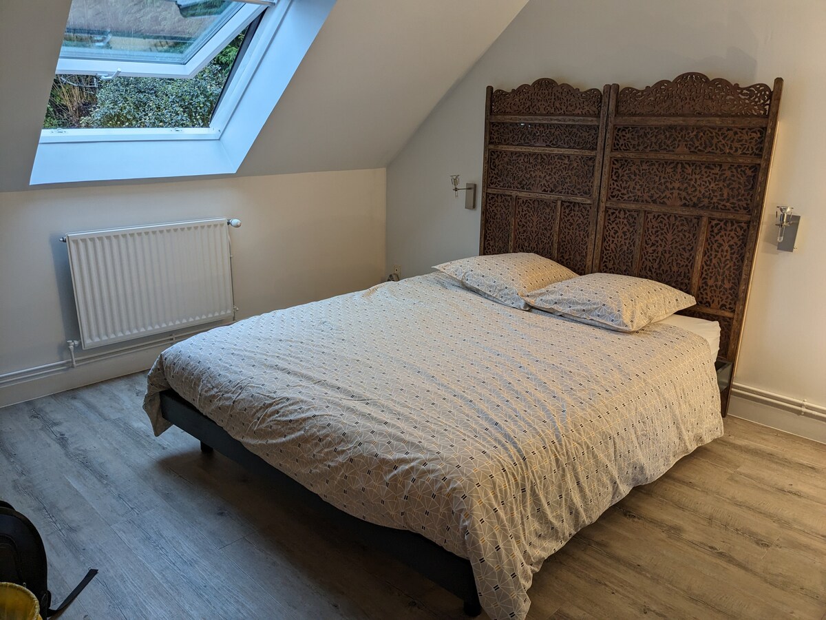 Vous apprécierez le calme et la luminosité de cette chambre mansardée. Au 3ème demi-étage d'une villa avec jardin située à 750m du RER B, la chambre (lit 160 cm) possède des toilettes et une grande salle de bain privative avec rangements. La chambre se ferme à clé. Une bouilloire est à disposition dans la chambre. Nous acceptons votre animal de compagnie sur demande (2 chiens et 4 chats dans la maison). Le petit-déjeuner est inclus.