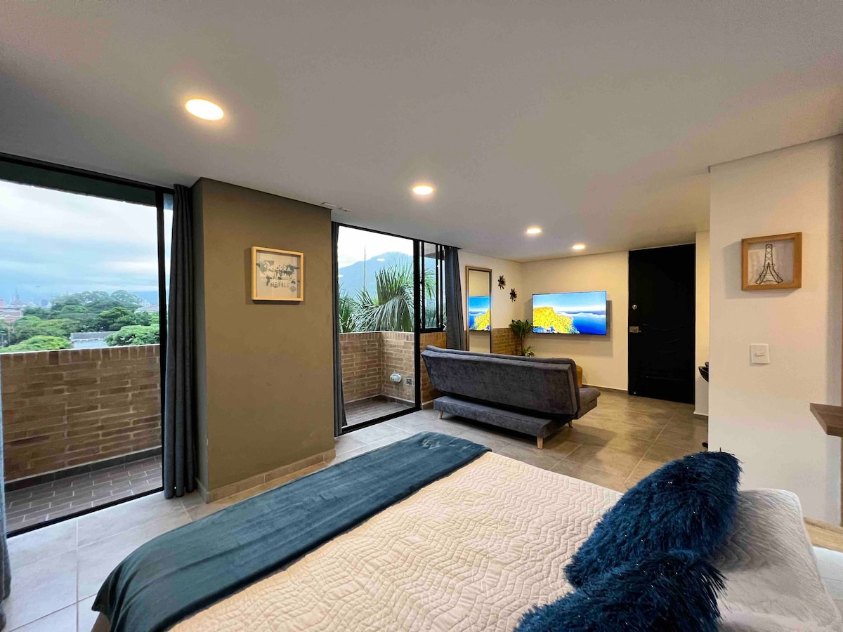 Bókaðu YA! Í fallega Cristales-hverfinu, Cali! Komdu og kynntu þér stúdíóið í herbergi sem við höfum hannað vandlega til að bjóða þér bestu útsýnið yfir Cali, þægilegan stað fyrir dvöl þína. Hannað með nútímalegum innréttingum og glæsilega í bland við staðbundin smáatriði til að gefa þér fallegt umhverfi. Ós kyrrðar! Ekki bíða lengur og bókaðu núna! Skref frá hundagarðinum og miðpunkti CoP16 MEÐ fallegum heitum potti með yfirgripsmiklu útsýni