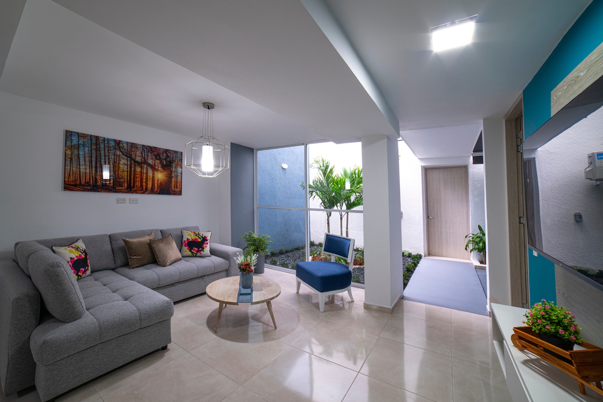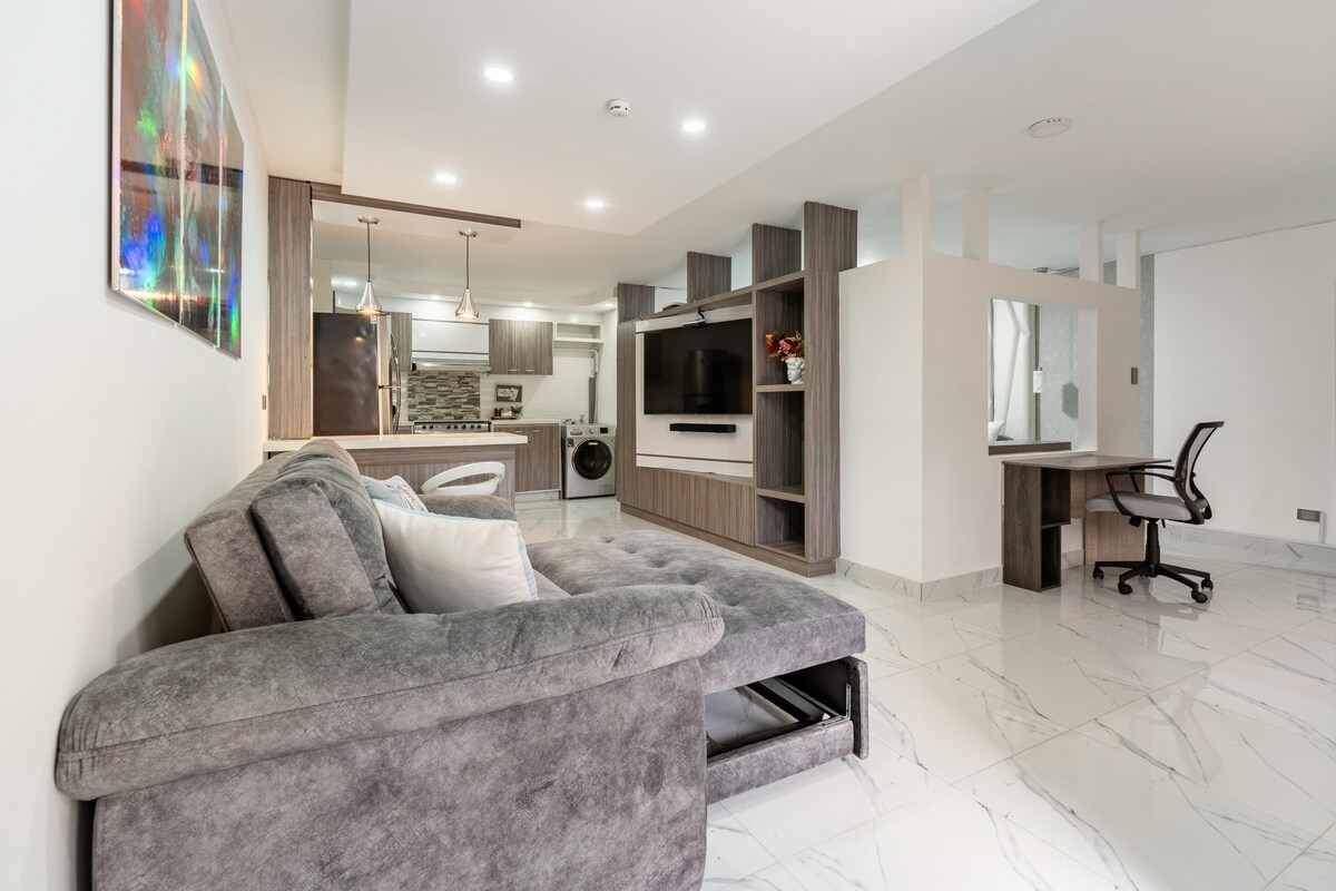 Þessi glænýja og lúxus íbúð með 1 svefnherbergi er frábær fyrir einstakt og rólegt frí, vinnukvöld eða langa dvöl í borginni okkar. Staðsett í Prados del Norte hverfinu, rólegur og rúmgóður staður nálægt ferðamannastöðum í Cali, nokkrar mínútur frá flugvellinum og samgöngumiðstöðinni. Þessi íbúð býður upp á allt sem þú þarft fyrir þægindi þín, með framúrskarandi staðsetningu er hægt að ná til áhugaverðra staða eins og veitingastöðum, börum, næturklúbbum, matvöruverslunum, apótekum og margt fleira.
