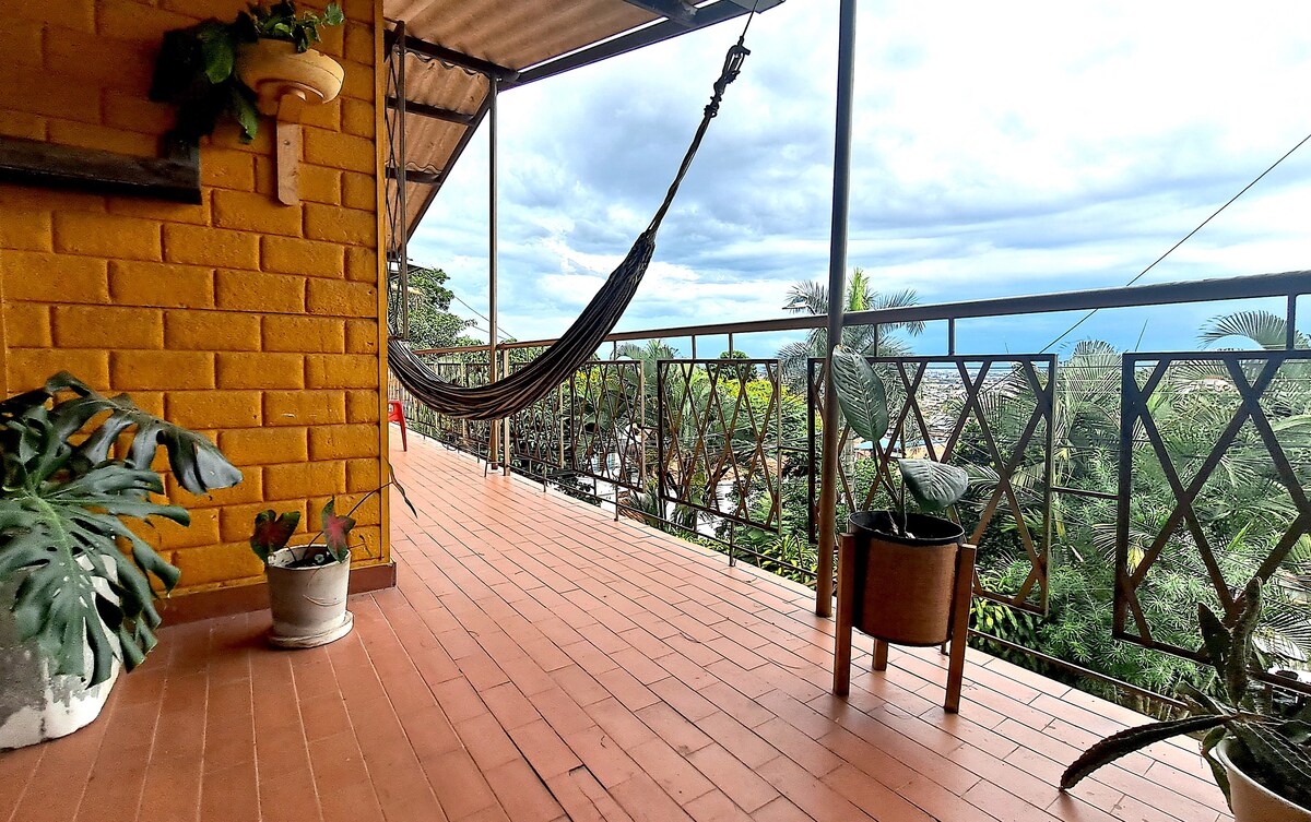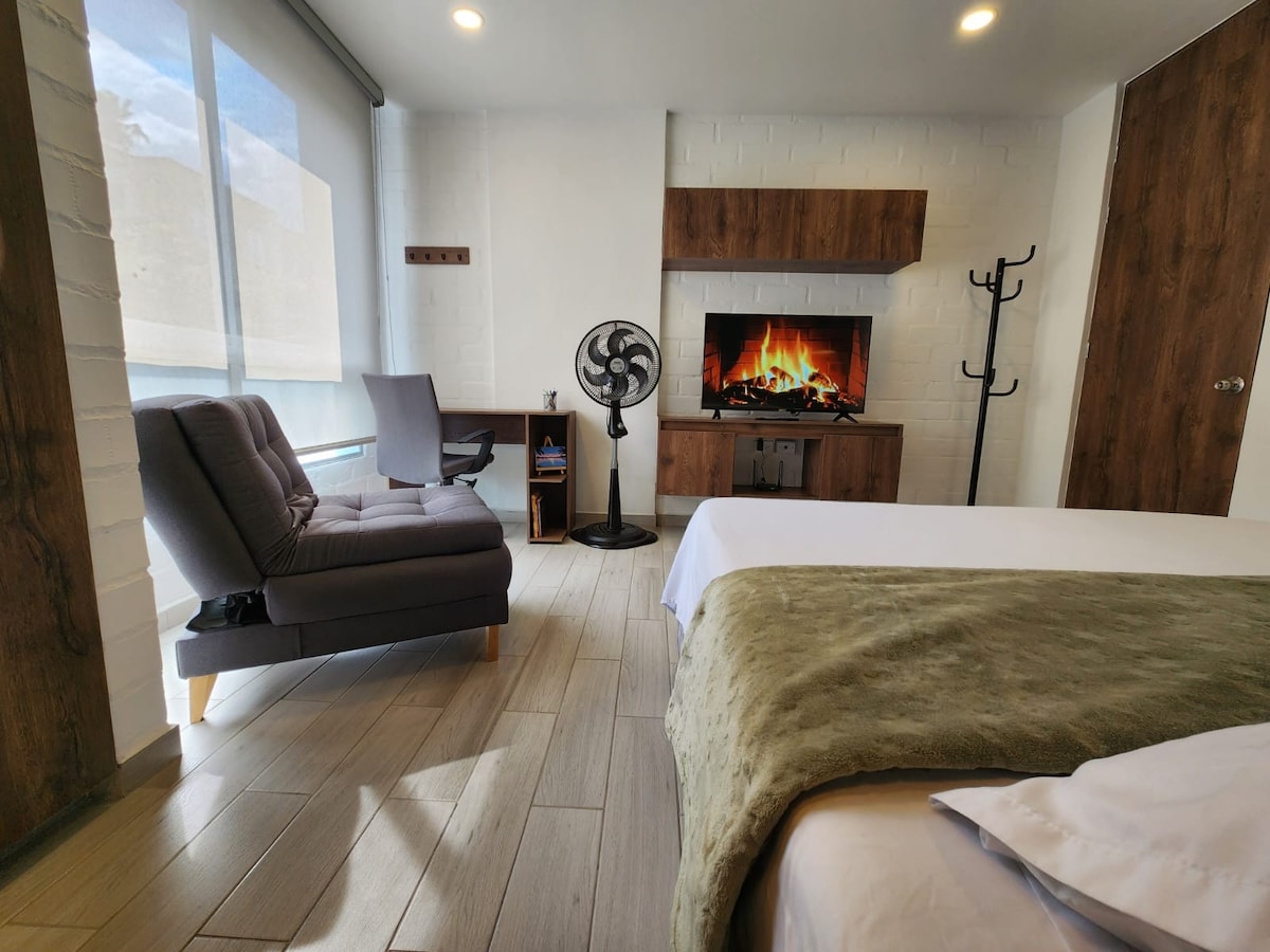 Loftíbúð á 7. hæð með ótrúlegum svölum og útsýni yfir garðinn. Það samanstendur af herbergi með hágæða king-size rúmi, baðherbergi og einka kommóðu, fullbúið með loftkælingu, 300mb þráðlausu neti, öryggishólfi, snjallsjónvarpi með Netflix áskrift og nokkrum sjónvarpsrásum. Eldaðu með áhöldum. Hayedo de Juanambu byggingin er með móttöku með einkaöryggi allan sólarhringinn, lyftum , yfirbyggðum bílastæðum, líkamsræktarstöð , tyrknesku, vinnuaðstöðu, sundlaug á 9. hæð.