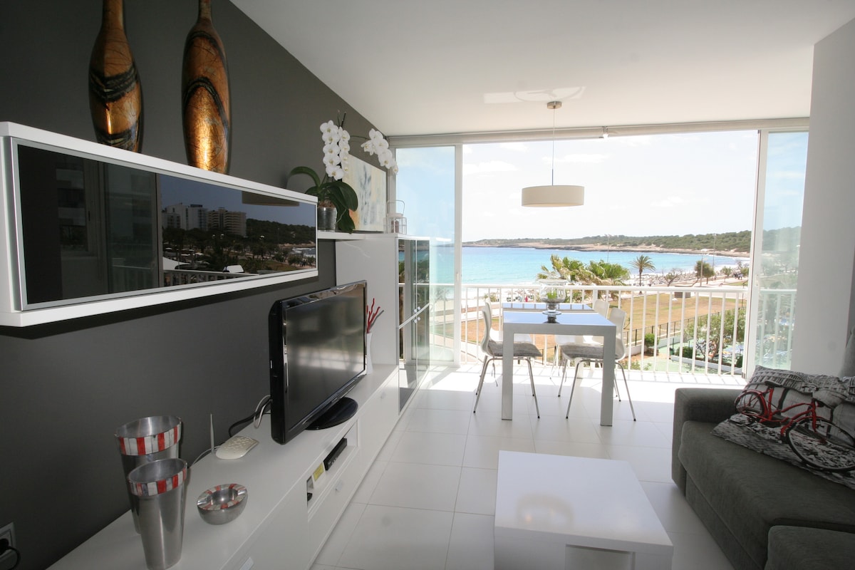 Dásamleg íbúð við ströndina með mögnuðu 180° sjávarútsýni með öllum þægindum til að líða vel. Ný íbúð, fullkomlega enduruppgerð. Bygging umkringd veitingastöðum, verslunum, matvöruverslunum og apótekum. Í 10 mínútna göngufjarlægð eru stórmarkaðir eins og Mercadona og Lidel. (Stórar matvöruverslanir) - Gengi ferðamannaskatts á Balear-eyjum - Gjaldið (2,5 evrur) er innheimt á hvern gest á nótt við innritun. Börn 16 ára og yngri eru undanþegin.