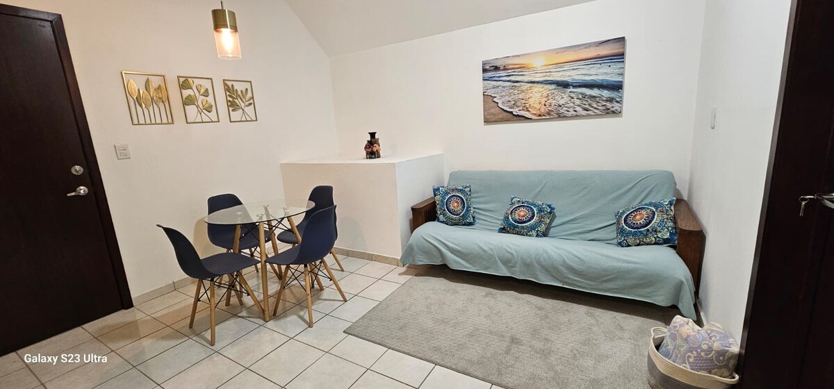 Heimsókn til Mazatlán? Frábært! Við erum með frábæran stað. Íbúð 2 hefur það sem þú þarft: Staðsetning á ✔️ fyrstu hæð 🔒 Inni í öruggri byggingu sem er aðgengileg með kóðum 🛏️ Queen-rúm fyrir 2, hámark 4 ef þú leigir uppblásanlega dýnu ($ 300 MXN) 🚽Baðherbergi 🌬️ Minisplit (AC eining) Vel 🥄 búið eldhús 📺 Snjallsjónvarp 🚀 Internet Auk þess er boðið upp á verönd með sundlaug, grilli og barstofu á 3. hæð. 5 mín. frá gullna svæðinu (Zona Dorada) og nálægt veitingastöðum, Soriana og Walmart.