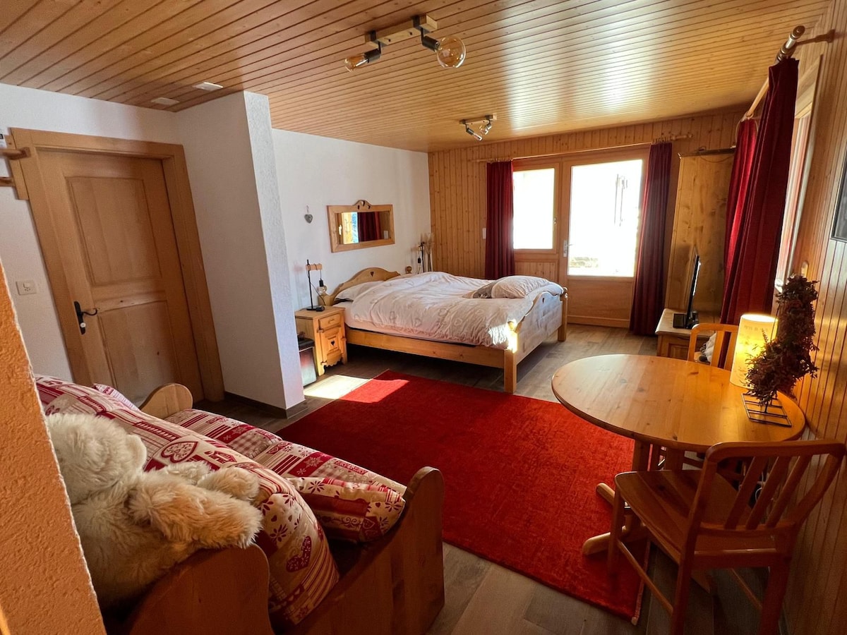 Á veturna er hægt að skíða inn / skíða beint frá skálanum á Portes du Soleil svæðinu 600 km + af brekkum milli Frakklands og Sviss! Fullkomið fyrir 2 en rúmar allt að 4 manns minna. Þetta 27 m2 stúdíó í tveggja íbúða skála í 1600 metra hæð yfir sjávarmáli. Sófi sem hægt er að nota sem aukarúm fullkomnar stúdíóið. Skíðaherbergi er í boði til að geyma skíðabúnaðinn þinn.