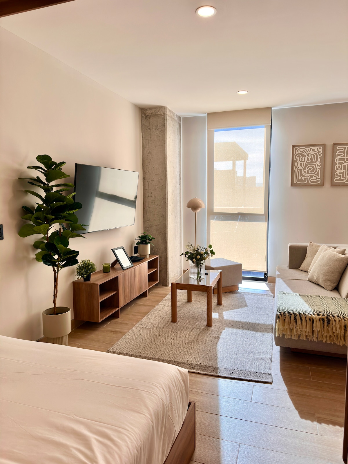 Slakaðu á í Espacio Calma, fallegri, bjartri og stílhreinni íbúð með fallegu útsýni yfir almenningsgarðinn. Hún er staðsett á annarri hæð nútímalegri íbúðarbyggingu og hentar fullkomlega fyrir vinnu heima frá og afslappandi frí. Íbúðin er þægilega nálægt Expo Guadalajara, matvöruverslunum, verslunartorgum, veitingastöðum og almenningsgörðum og það er auðvelt að komast um alla borgina þar sem hún er nálægt nokkrum af helstu breiðstrætum Guadalajara.