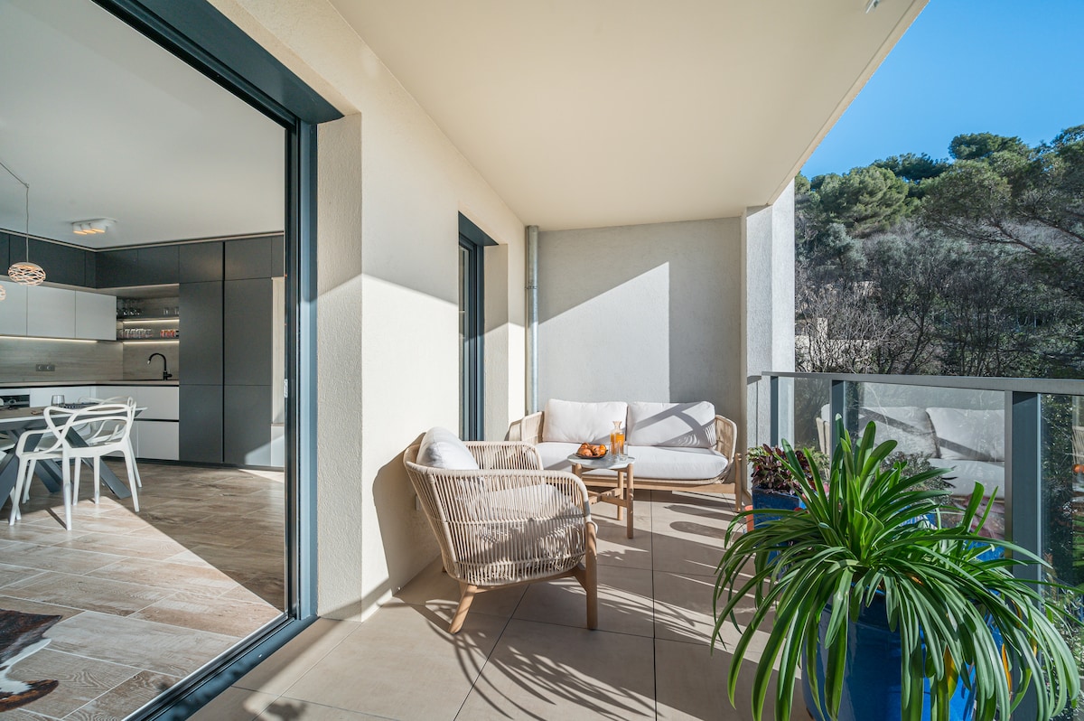 "SEAVIES BY JENNI MENTON"kynnir: Glæsileg NÝ 2 herbergi við ströndina við Promenade du Soleil. 50 m2 hönnun,stór verönd á 18 m2, sjávarútsýni eins og á bát um íbúðina. Hannað til þæginda fyrir 4. Mjög eftirsóttar innréttingar, vönduð efni og þægindi. LOKAÐUR BÍLSKÚR * LYFTA CLIM SNJALLSJÓNVARP ÓTAKMARKAÐ HÁHRAÐANET BOSE BLUETOOTH HÁTALARI Í göngufæri frá öllum verslunum og afþreyingu. Strætisvagn neðst í húsnæðinu, lestarstöð fótgangandi.