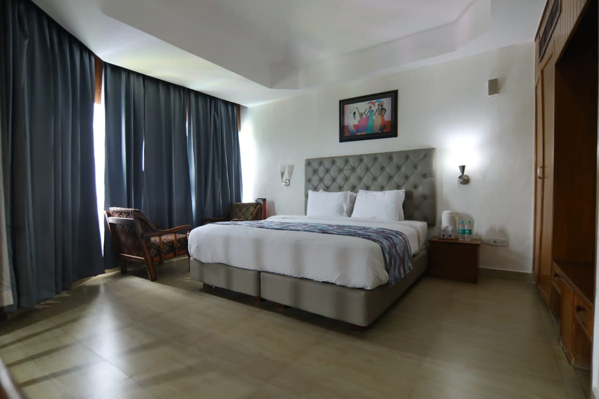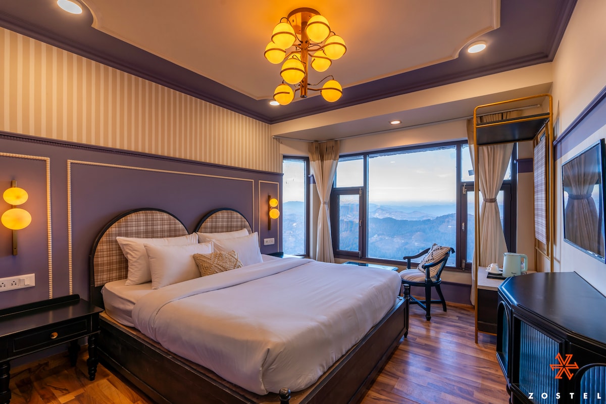 ◆Aðeins 4,7 km frá Shimla-flugvelli ◆Svítusett innan um töfrandi fjallasýn ◆Er með kringlótt lúxusrúm og aðliggjandi baðherbergi ◆Hlýleg lýsing og nýtískulegur ljósabúnaður bæta andrúmsloftið ◆Fágaðar viðarinnréttingar bjóða upp á notalega og flotta stemningu ◆Stórir gluggar með mjúkum hvítum gardínum bjóða upp á náttúrufegurð ◆Fullkominn staður til að njóta kyrrðarinnar í sjarma Shimla