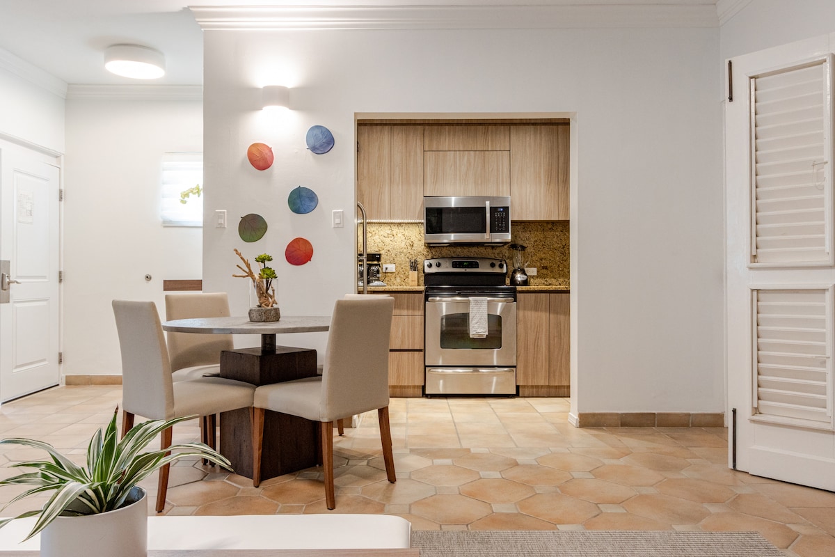 Beautiful Apartamento for 2 people totally independent (they are 5 in total) we HAVE SOLAR PANELS, with independent entrance, every 1 with bedroom, bathroom, kitchen, stove, microwave, washher, dryer, air conditioning in the room , wifi, private parking decor with murals, patio with projector and Bbq, roku Tv and netflix. Nálægt öllu! Matvöruverslanir ,sjúkrahús , apótek, mínútur frá Seven Seas Beach