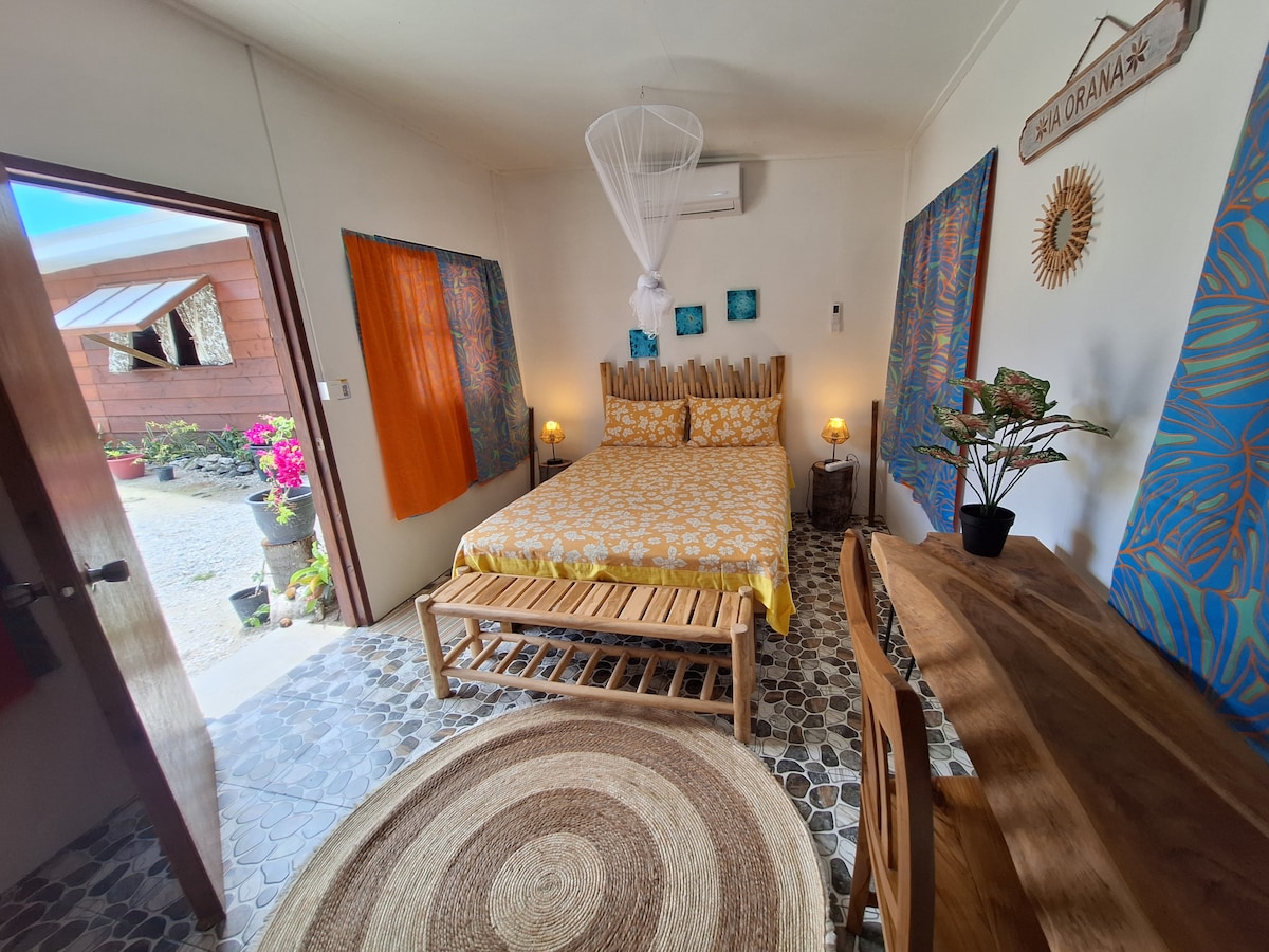 Flott smáhýsi í Norður-Fakarava með mjög náttúrulegum innréttingum í hljóðlátum blómlegum garði í 40 metra fjarlægð frá Fakarava-lóninu. Gistingin er glæný, mjög vel búin (þráðlaust net, sjónvarp með Netflix, loftkæling, heitt vatn og fullbúið eldhús). Þú verður nálægt hinum ýmsu litlu verslunum (þar á meðal bakaríinu í 200 metra fjarlægð) og öðrum þægindum. Þú getur gengið um án endurgjalds. Við vonum að þú getir átt eftirminnilega dvöl í Fakarava!
