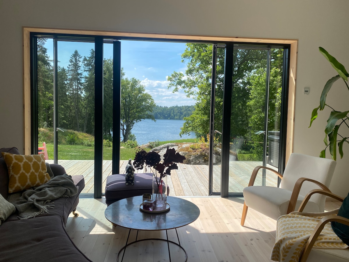 Verið velkomin í 32 fermetra opið strandhús með útsýni yfir Mälaren-vatn. Það er eldhúskrókur með tveimur ofnum, samsettum ofni/örbylgjuofni og ísskáp. Í herberginu er 140 cm rúm, tveir sófar og arinn. Baðherbergið er með salerni, sturtu og þvottavél. Úti er einkaverönd með aðgangi að sameiginlegri strönd. Athugaðu: Myrkra gluggatjöld vantar svo þér er velkomið að koma með svefnmaskefni ef þú ert viðkvæm(ur) fyrir ljósi. Húsið er staðsett á hluta stærri lóðar í náttúruverndarsvæði.