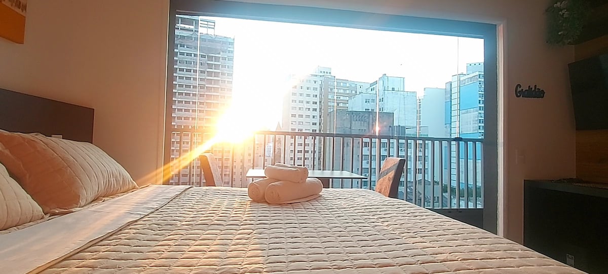 Studio de 40 m2 aconchegante com vista e localização privilegiada. Varanda com vidros e persianas blackout, sofá cama king, lençóis macios e cheirosos de 200 fios , secador de cabelos TAIFFY ,mesa, cadeiras e uma linda vista. Cozinha equipada: geladeira, forno elétrico, fogão, micro-ondas, cafeteira e liquidificador. Taças de espumante, vinho, água e cerveja .Pratos, xícaras, talheres e uma bancada para refeições. Smart TV, ar-condicionado, Wi-fi, vaga garagem e Self check-in😀