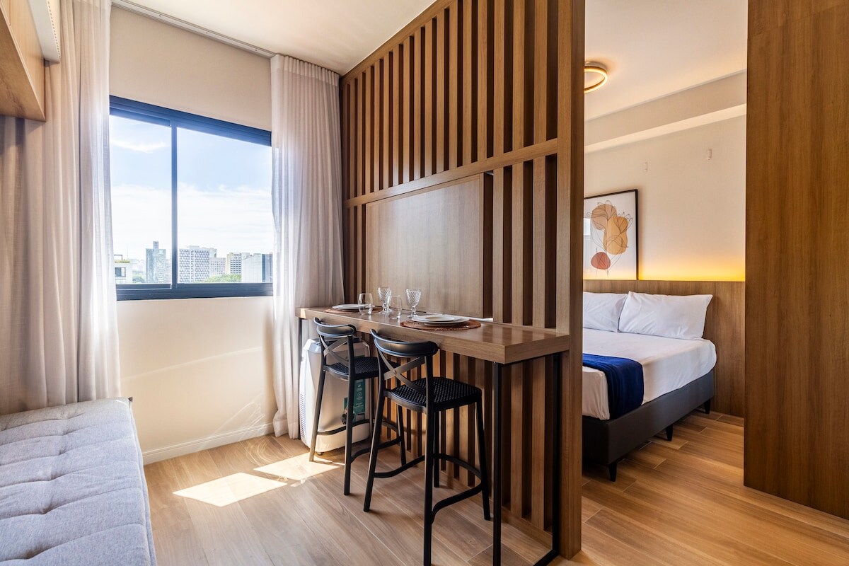 Enjoy practicality and warmth in this peaceful and well-located place in Moema, a prime area of São Paulo. Close to Ibirapuera Park and the Moema subway station, it is the ideal place for gastronomic, cultural, leisure and business tourism. Decorated studio with equipped kitchen, bed and bath linen, air conditioning and Wi-Fi. New building overlooking the park, offering a pool, gym, co-working, laundry and 24-hour concierge.