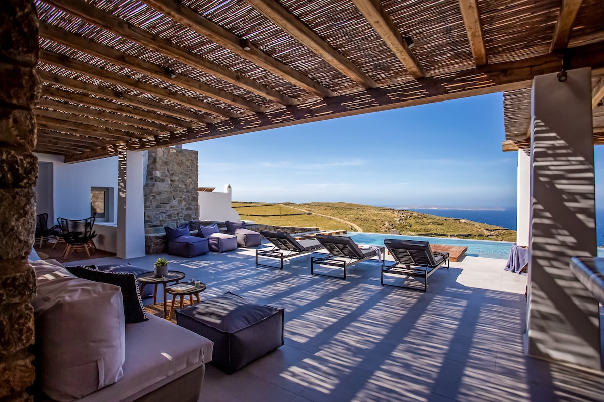 Einkahönnun luxe villa, myndskreytt „á klettunum“, staðsett á fallegasta og yfirgripsmikla staðsetningu með útsýni yfir endalausa bláa sjóndeildarhringinn. Við höfum bætt við ótrúlegum einkapott utandyra sem hentar fyrir 5 manns. Laugin, sem liggur á milli óendanlega bláa hafsins og himinsins veitir djúpslökun og sjávarföllin er einn af glæsilegustu eiginleikum.