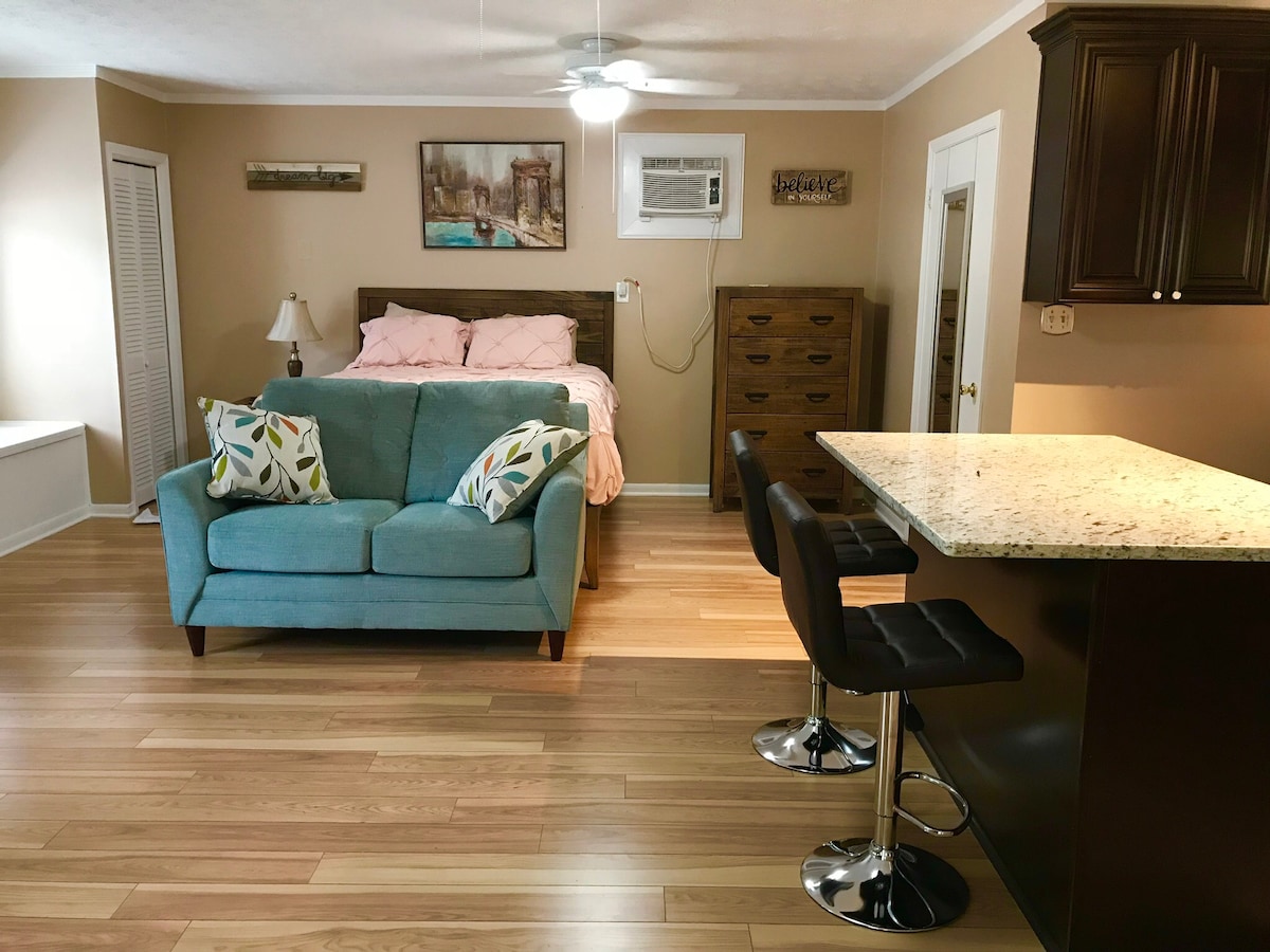 Slappaðu af í þessari friðsælu vin. Notalegt 1 svefnherbergi, 1 baðherbergi einkarými fyrir gesti í 5 hektara eign í Fayetteville. Eitt svefnherbergi með king-rúmi, fullbúnu baðherbergi og stórum fataherbergi. Stofa með sjónvarpi. Eldhús með ofni, eldavél og barstólum til að borða. Þvottavél og þurrkari fylgja. Einkavöllur í boði frá 10a-3p. Vinsamlegast sendu gestgjafa skilaboð þegar þú notar dómstól. Róður og boltar í boði á staðnum. Vinsamlegast hafðu í huga að dómstóllinn er endurfrágenginn. 30 daga lágm. Þetta er eign sem má ekki reykja.