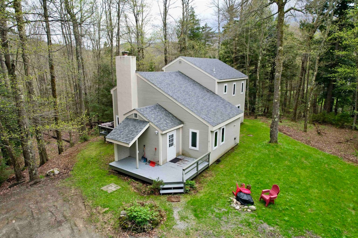 Vaknaðu með mögnuðu útsýni yfir Sugarbush í þessu „Flat Roof A-Frame“. Fjögur svefnherbergi, svefnloft, þrjú baðherbergi, tvær stofur, borðstofa, nýuppgert eldhús, skrifborð með þráðlausu neti, tvær verandir (ein m/gasgrilli) og þvottahús/leikjaherbergi veita nægt pláss fyrir fjölskyldusamkomur. Staðsett í 3 mínútna fjarlægð frá bænum. Hentar ekki litlum börnum/smábörnum eða gestum með hreyfihömlun. Á sumrin leigjum við aðeins út gistingu í meira en 6 nætur með breytingum á föstudegi.