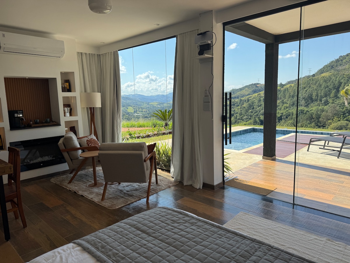 Refúgio romântico em meio à natureza, ideal para casais. Chalé estilo suíço (A-frame) em sítio cercado por cafezais, com rio e cachoeira particulares. Possui banheiras externas com vista para a Serra da Mantiqueira, jacuzzi interna, fogueira, churrasqueira, quadra de beach tênis, cama-balanço, sauna seca com vista e projetor interno com telão de 100”.