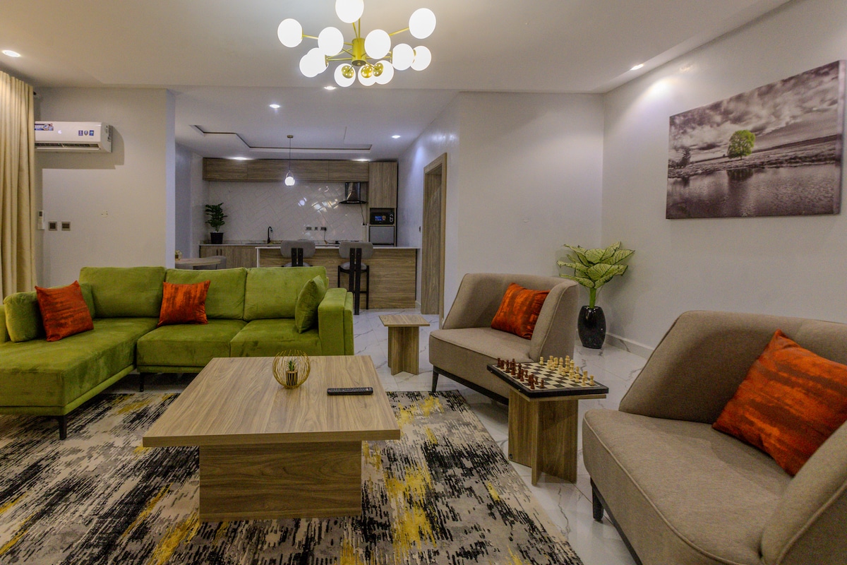 Fjögurra herbergja íbúð með öllum sérherbergjum og eldhúsi sem gestir geta notað. Íbúðin er í miðbæ Abuja nálægt bönkum, verslunarmiðstöðvum og verslunarmiðstöð. Það er í engri fjarlægð frá öllum lykilsvæðum stórborgarinnar með frábærum hönnuðum gönguferðum um umhverfið með aðgangi að líkamsræktarstöð, leikvelli fyrir börn, fótboltavelli, ókeypis bílastæði og einstöku rými.
