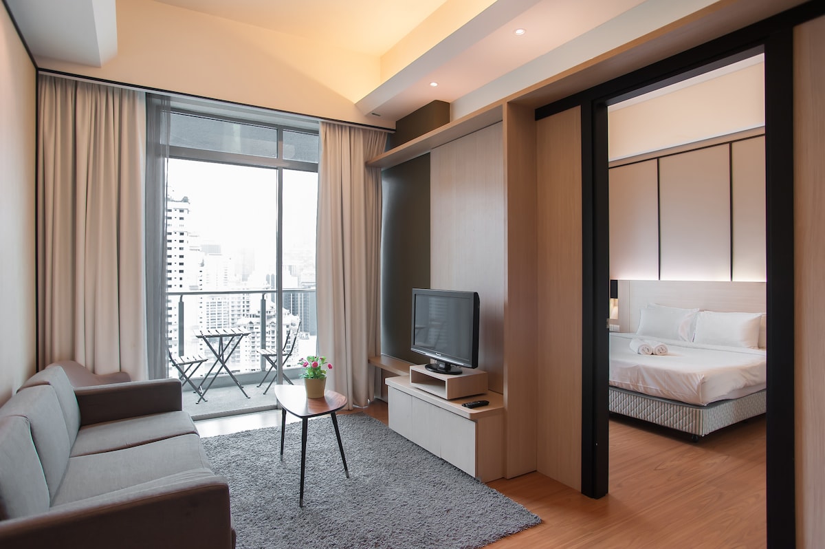 Glæsileg 1BR sky svíta með einkasvölum sem snúa að KLCC og KL Tower. Njóttu þess að borða á svölunum á meðan þú horfir á skínandi birtusýningar frá báðum táknrænu turnunum á hverju kvöldi. King-rúm, regnsturta, fullbúið eldhús, þvottavél með þurrkgrind, Netflix og háhraða þráðlaust net. Slakaðu á í endalausu lauginni, nuddpottinum á þakinu og líkamsræktinni. Gakktu að Jalan Alor, Pavilion, Bukit Bintang og nýju TRX-verslunarmiðstöðinni. Innritun allan sólarhringinn. Akstur frá flugvelli og staðbundnar ferðir í boði. Fullkomin dvöl þín í KL hefst hér!