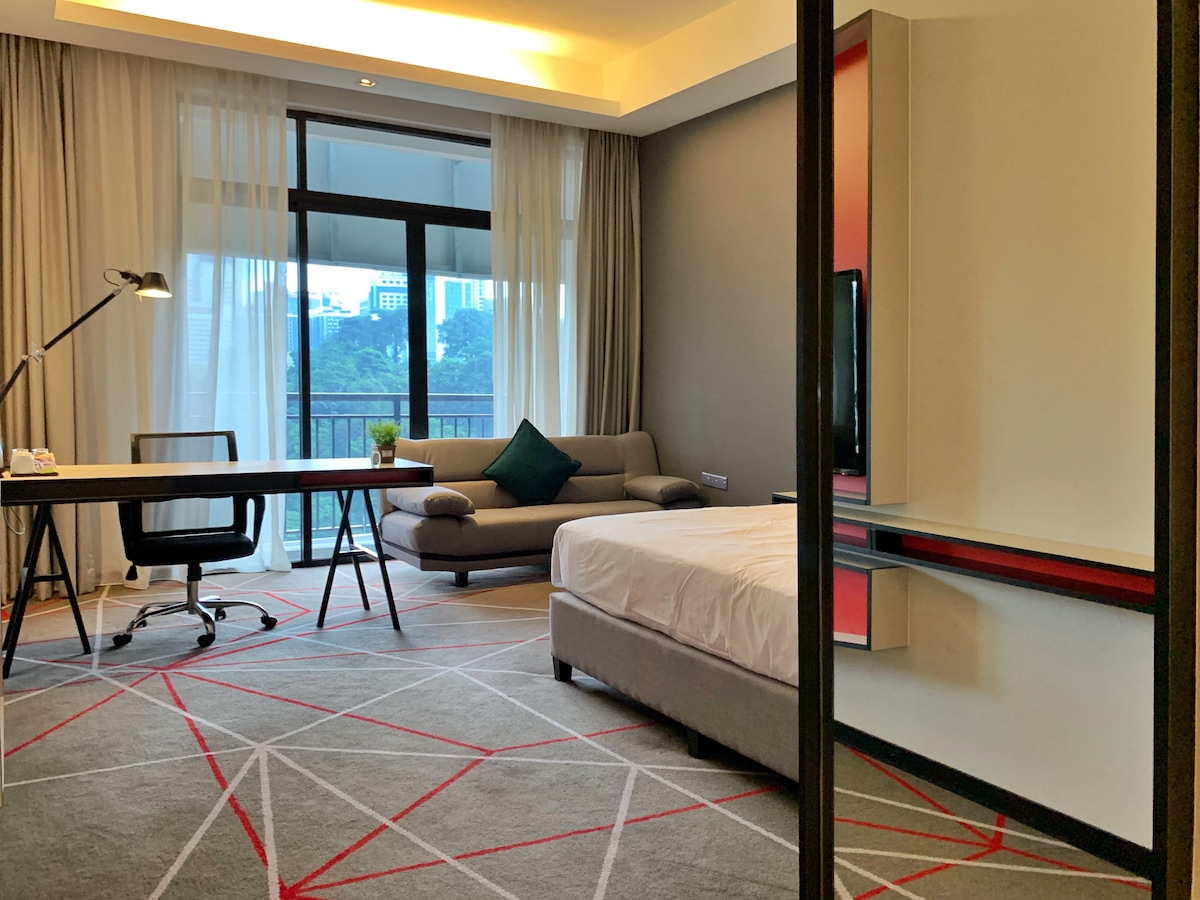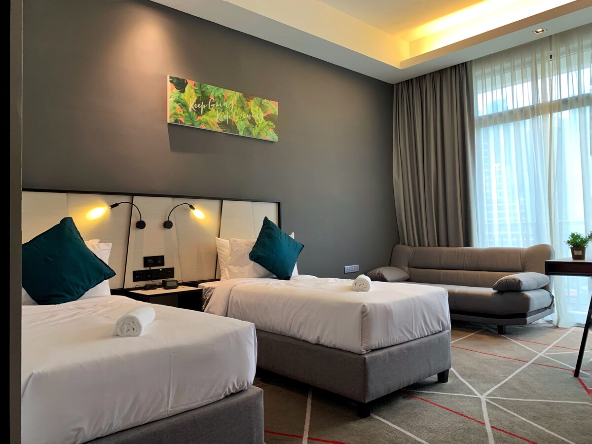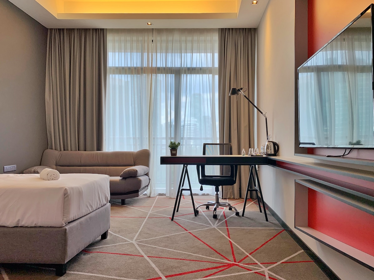 M101, þægilegt og notalegt — einfaldleiki í hámarki. Fullkomlega staðsett í hjarta Kuala Lumpur, í aðeins 4 mínútna göngufjarlægð frá Dang Wangi LRT og í 7 mínútna göngufjarlægð frá Medan Tuanku Monorail sem býður upp á greiðan aðgang að helstu áhugaverðu stöðum borgarinnar. Kynnstu bragðinu á veitingastöðum í nágrenninu meðfram The Row, verslaðu textílefni og fylgihluti í Jalan Tunku Abdul Rahman eða slappaðu af með hressandi ídýfu í þaksundlauginni með útsýni yfir hinn þekkta KL-turn.