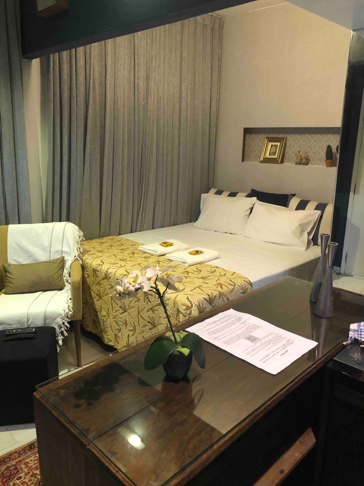 Þétt og hagnýtt rými Tilvalið fyrir tvo. Vcs mun sofa á queen-size rúmi með bæklunardýnu, bómullarlökum, verður með skiptri loftræstingu, myrkvunargluggatjöldum, 43 tommu snjallsjónvarpi, þráðlausu neti, DVD-diski og litlu eldhúsi með minibar, kaffivél, hraðsuðukatli, vatnssíu, leirtaui og hnífapörum. Við samþykkjum aðeins minnst tvær nætur fyrir gistingu í íbúðinni okkar!