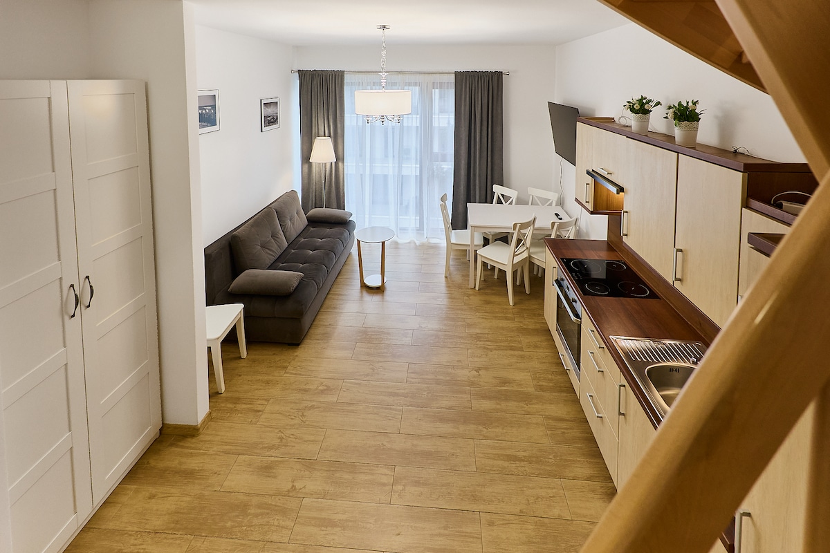 Íbúð á 16. hæð í miðbæ Szczecin er fullkominn staður til að slaka á. Herbergið er búið king-size rúmi, sjónvarpi og rafmagnsarinn sem skapar notalega stemningu. Í eldhúskróknum er ofn og spanhelluborð og á baðherberginu er nútímaleg sturta. Gestir geta notað útsýnispallinn á 27. hæð og vellíðunarsvæðið með sundlaug, heitum potti og tveimur gufuböðum fyrir algjör þægindi og afslöppun.