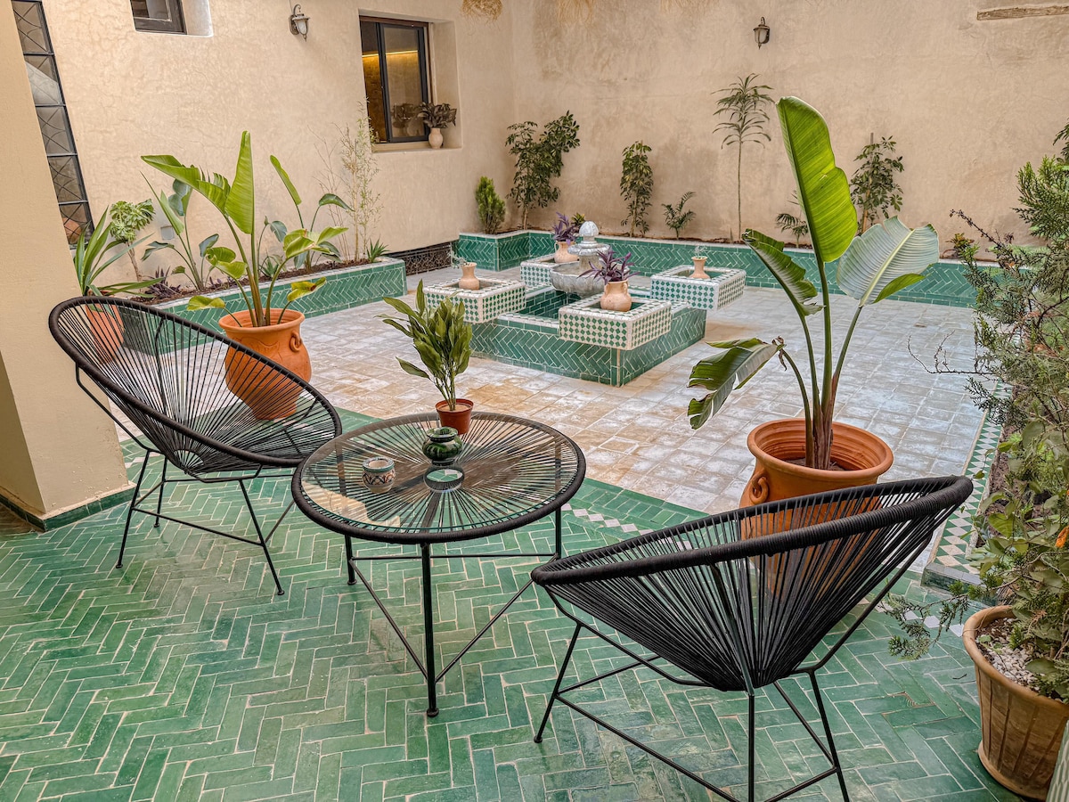 Veldu vandlega enduruppgert einkarekið riad sem er tilvalið fyrir fjölskyldur í leit að áreiðanleika, þægindum og ró í hjarta Fez. 3 stór svefnherbergi með king-size rúmum, 3 loftræstingar, 4 snjallsjónvörp, 2 ítölsk baðherbergi, Marrakech tadelakt stofa, borðstofa, berbahorn, útbúið eldhús og beldi zellige verönd með gosbrunni. Einstakur staður þar sem marokkósk hefð og nútímaþægindi samræmast ógleymanlegri dvöl.