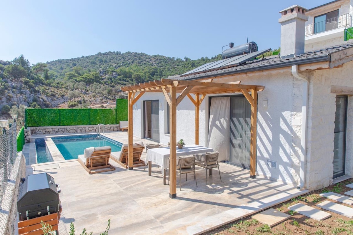 Þessi einstaki staður hefur sinn eigin stíl. Húsið okkar hefur 2 stórar laugar inni og úti staðsett í Kayaköy, Fethiye. Upphitun innisundlaugar er í boði. Einnig er heitur pottur í útisundlauginni og innisundlauginni. Villan er úthugsuð og innréttuð í lúxushugmynd og með skjólgóðri sundlaug. Það býður upp á stórkostlegt frí fyrir brúðkaupsferðapör og kjarnafjölskyldur. 10-15 mínútur í Fethiye center eða Ölüdeniz center. Með einkabílastæði.