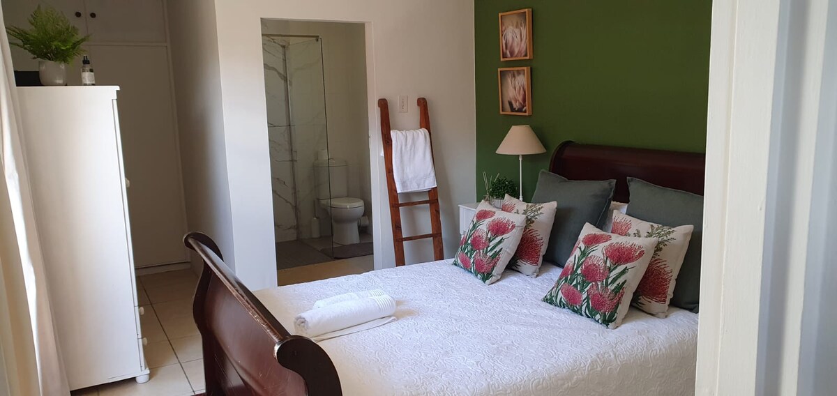 Þessi nútímalegi og glæsilegi bústaður með sjálfsafgreiðslu er staðsettur í öruggu íbúðarhverfi við hliðina á stærsta öryggisfyrirtækinu í bænum. Hér er þægilegt að taka á móti tveimur fullorðnum með aukarúmi sem er hægt að breyta í 2 einbreið rúm eða 1 queen-rúm. Fullkomið gistirými fyrir hvern einstakling og fjölskyldu . Íbúðin er aðskilin frá aðalbyggingunni á lóðinni og þar er baðherbergi innan af herberginu með sturtu og fullbúnu eldhúsi. Öruggt bílastæði við hlið. Þráðlaust net, DSTV og Netflix eru einnig í boði.