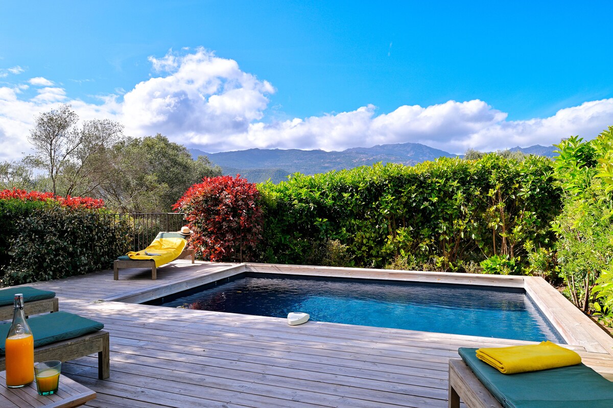 Verið velkomin í kyrrðina og fegurðina í Alivaccia. Í hjarta þessa fallega þorps er frábært útsýni yfir landslagið í kring. Hvert gistirými er með einkasundlaug sem er meðhöndluð með salti og hituð frá apríl til maí sem og í október sem tryggir afslöppun og friðsæld á öllum árstímum. Loftræsting í hverju herbergi. Njóttu varðveitts náttúrulegs umhverfis sem sameinar þægindi, kyrrð og ósvikinn korsískan sjarma.