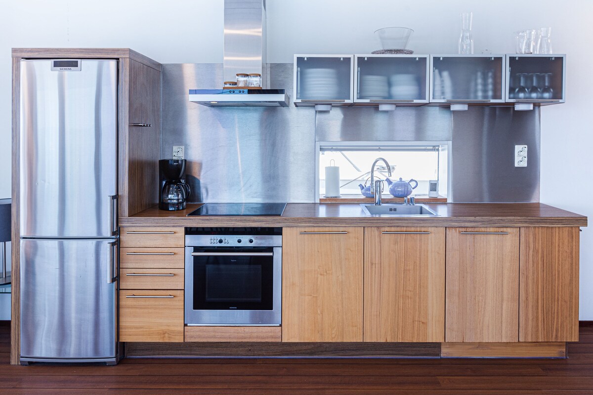 Njóttu sérstakrar og góðrar gistingar við vatnið í byggðum húsbát 2018 rétt fyrir framan nýja Tampere sem er aðeins 1,5 km frá lestarstöðinni. Njóttu sólsetursins eftir gufubað á þremur veröndum. Þetta er alvöru 2 in 1 pakki: íbúð og cottageholiday. Frá 1. Getur einnig verið að efri hæðin sé í notkun. Vinsamlegast athugaðu framboð áður en þú bókar þar sem bátnum hefur verið lyft upp fyrir þjónustuna veturinn 2023/4.