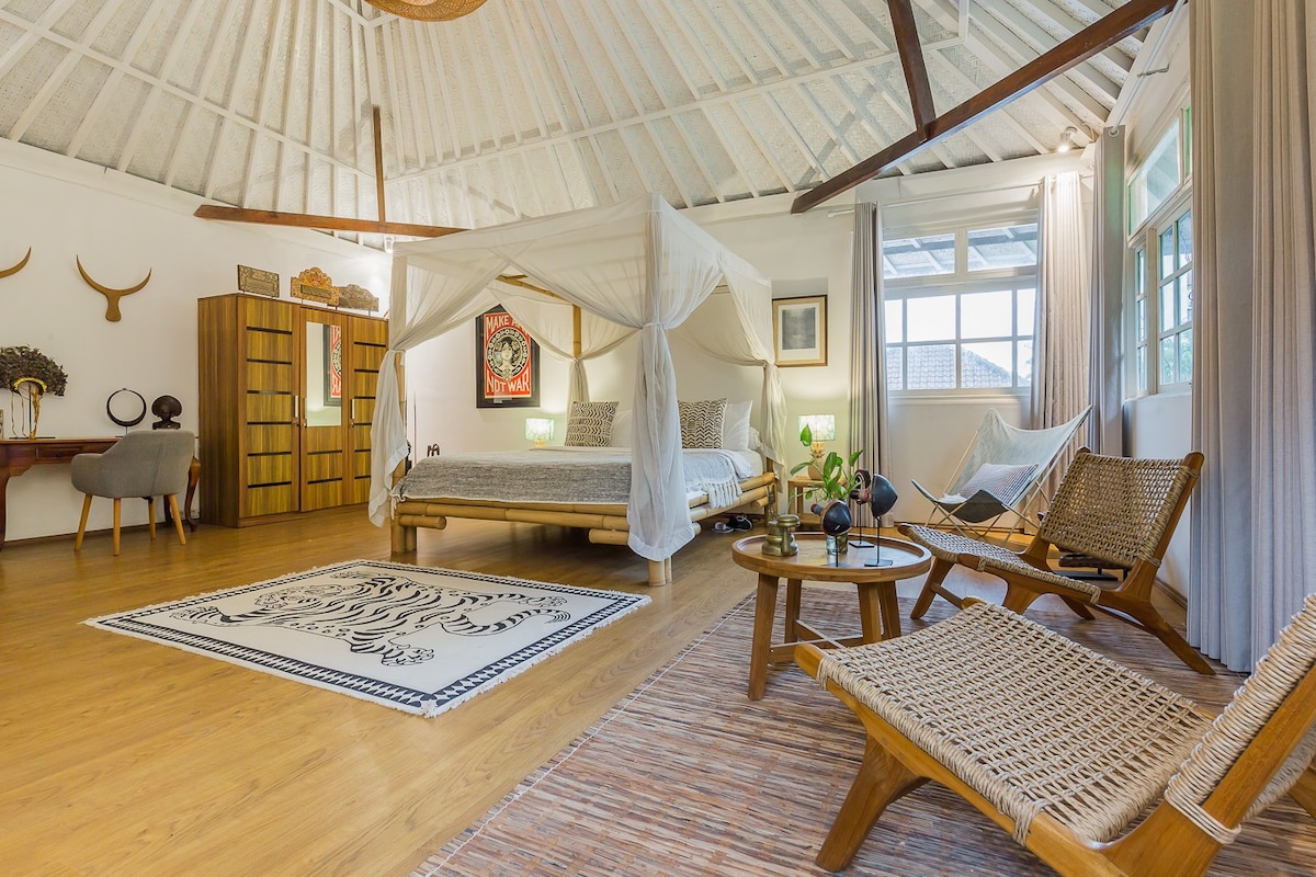 Ekta balískt tréhús ofan á múrsteinskastala. Sjaldgæf uppgötvun á Balí, rúmgóð, sjarmerandi og næði. Líflegir garðar í nokkurra mínútna fjarlægð frá Berawa Surf Beach, Finns & Atlas Clubs & Restaurants. Svefnherbergi/stofa með king-size rúmi, sérbaðherbergi, svölum og sjónvarpi, fullkomið fyrir vinnu eða afþreyingu. Á neðri hæðinni er sameiginlegt eldhús, borðstofa og setustofa. Útbreiddir garðar sem eru meira en 500 fermetrar að stærð og 10 metra laug. Önnur rými airbnb.ca/h/Joglo1 airbnb.ca/h/joglo2 airbnb.ca/h/duajoglos airbnb.ca/h/wholevilla