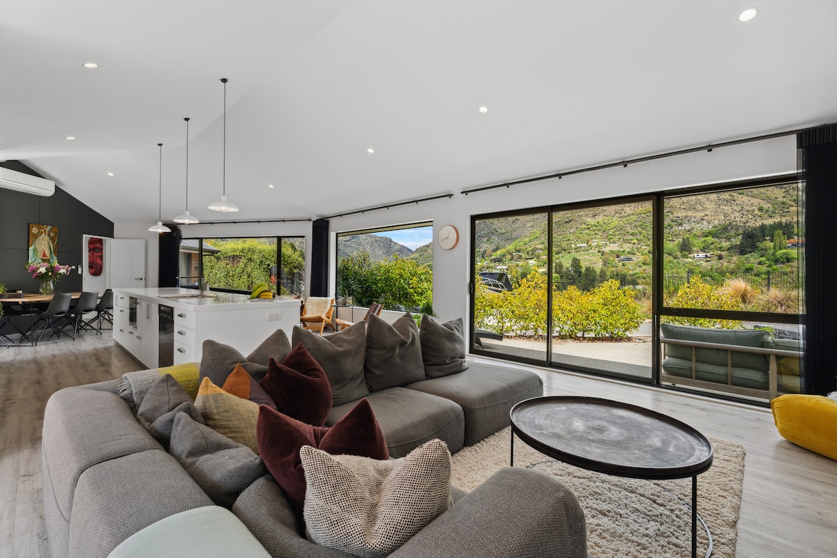 Þetta nýbyggða heimili með geislandi upphitun á gólfi mun vefjast um þig og láta þér líða vel, slaka á og vera tilbúin/n fyrir allt sem Queenstown hefur upp á að bjóða. Leggstu til baka og njóttu útsýnisins yfir Remarkables-fjallgarðinn frá svölunum í heilsulindinni, stofunni, hjónaherberginu eða slakaðu á útihúsgögnunum. Saltvatnsheilsulindin rúmar 5 manns og er alltaf til reiðu fyrir bleytu. Eignin er tandurhrein og með 5 stjörnu gæða rúmfötum og útsýni yfir kjálka.