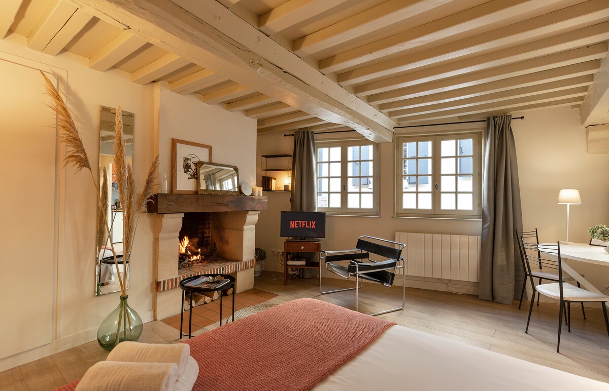 Uppgerð 26 m² stúdíóíbúð í friðsæla Impasse Saint-Jean, í hjarta Honfleur, aðeins nokkrum skrefum frá höfninni. Róleg og heillandi fyrir tvo gesti. Virkur arinn (viður fylgir ekki en er í boði í herbergisþjónustu). Rúm í queen-stærð, eldhús, baðker, Netflix, þráðlaust net. Sameiginlegt húsagarður. Ókeypis bílastæði í nágrenninu eða stórt bílastæði í 8 mínútna fjarlægð. Rúmföt og þrif innifalin. Gæludýr eru velkomin. Bókaðu núna!