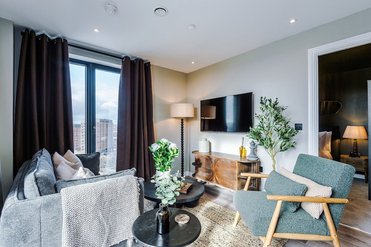 Verið velkomin á heimili þitt að heiman í hjarta Leeds. Rúmgóð eins svefnherbergis horníbúð í hefðbundinni byggingu á 2. stigi sem er miðpunktur bestu veitingastaða, bara og verslana borgarinnar við dyrnar. Njóttu fullkominnar blöndu af nútímalegri hönnun, þægindum og þægindum sem eru öll bundin við tímalausan glæsileika ~ fullkomið fyrir frístundir, fjarvinnu eða rómantískt frí. Komdu og upplifðu líflegu orkuna sem þessi ótrúlega borg hefur upp á að bjóða.
