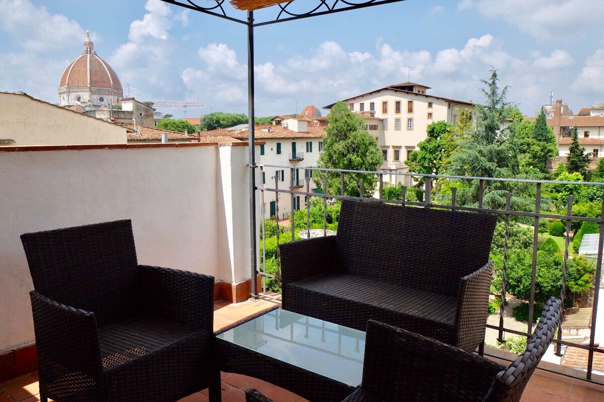 Suggestive penthouse with lift in the heart of Florence with a breathtaking 360 degree view over the whole city and its monuments. 15' walk from the Duomo. Refurbished with luxury finishes, it offers two double bedrooms and a small night space, all with bathroom and shower. The design kitchen is equipped with all necessary appliances and utensils. Large living room and terrace with pergotenda, sitting area, dining area and solarium. 1Gb WiFi, Smart TV. Free garage. Cot and high chair.
