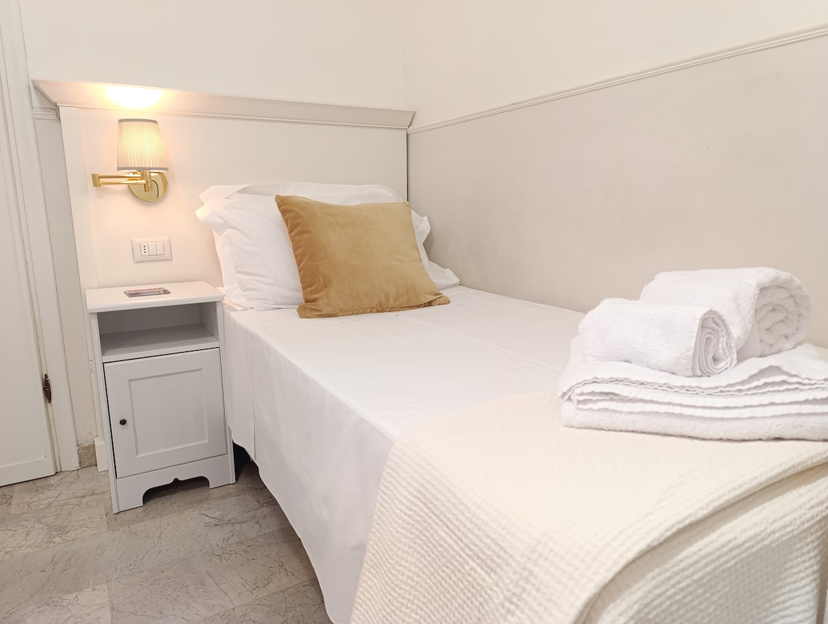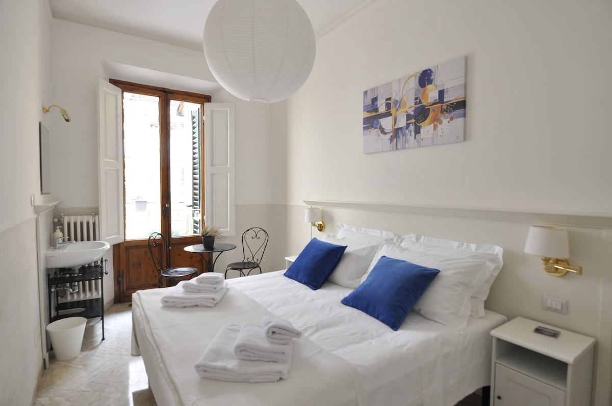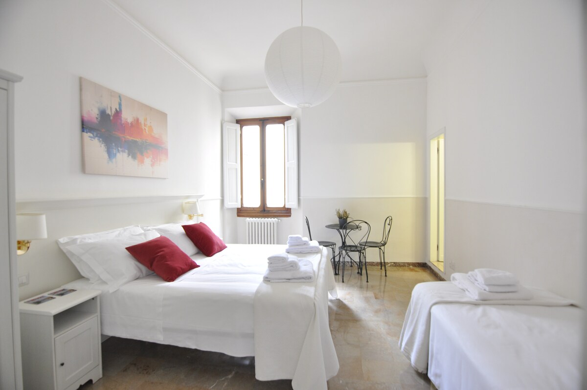 Double bed + sofa bed with kitchenette and private bath. The guest house is at easy walking distance from SMN train station and old town. Well connected by public transportation, tram stop right in front of the building. Access by car is possible since the place is not in the limited traffic zone. Garage Porta al Prato-Leopolda right next door. The room is equipped with AC, wi-fi, smart tv, kettle and fridge. The private bathroom is located in the corridor outside the room. Twin beds on request.
